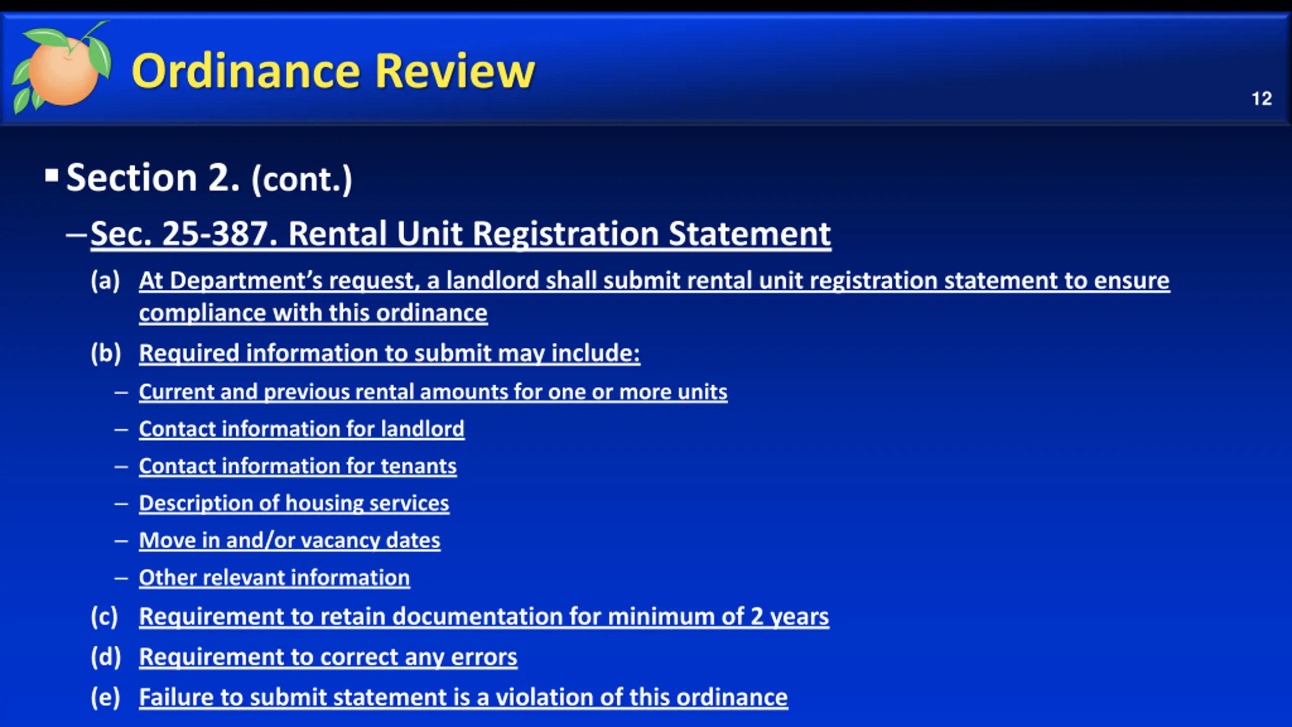 Ordinance Review 12 Section 2. (cont.) Sec. 25-387. Rental Unit Registration Statement (a) At Department s request, a landlord shall submit rental unit registration statement to ensure compliance with this ordinance (b) Required information to submit may include: Current and previous rental amounts for one or more units Contact information for landlord Contact information for tenants Description of housing services Move in and/or vacancy dates Other relevant information (c) Requirement to retain documentation for minimum of 2 years (d) Requirement to correct any errors (e) Failure to submit statement is a violation of this ordinance