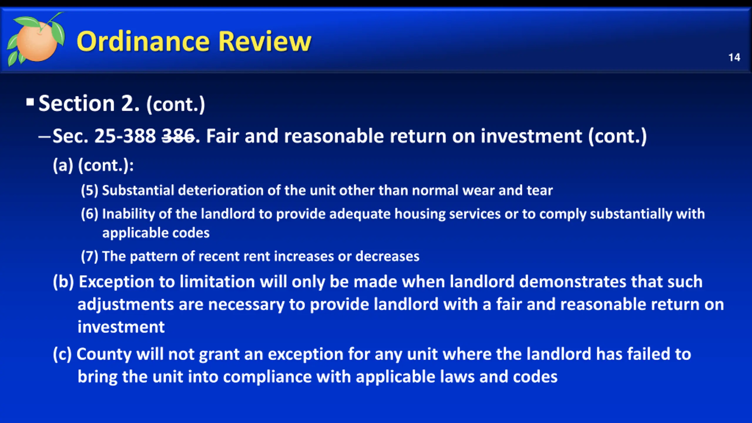 Ordinance Review 14 Section 2. (cont.) Sec. 25-388 386. Fair and reasonable return on investment (cont.) (a) (cont.): (5) Substantial deterioration of the unit other than normal wear and tear (6) Inability of the landlord to provide adequate housing services or to comply substantially with applicable codes (7) The pattern of recent rent increases or decreases (b) Exception to limitation will only be made when landlord demonstrates that such adjustments are necessary to provide landlord with a fair and reasonable return on investment (c) County will not grant an exception for any unit where the landlord has failed to bring the unit into compliance with applicable laws and codes
