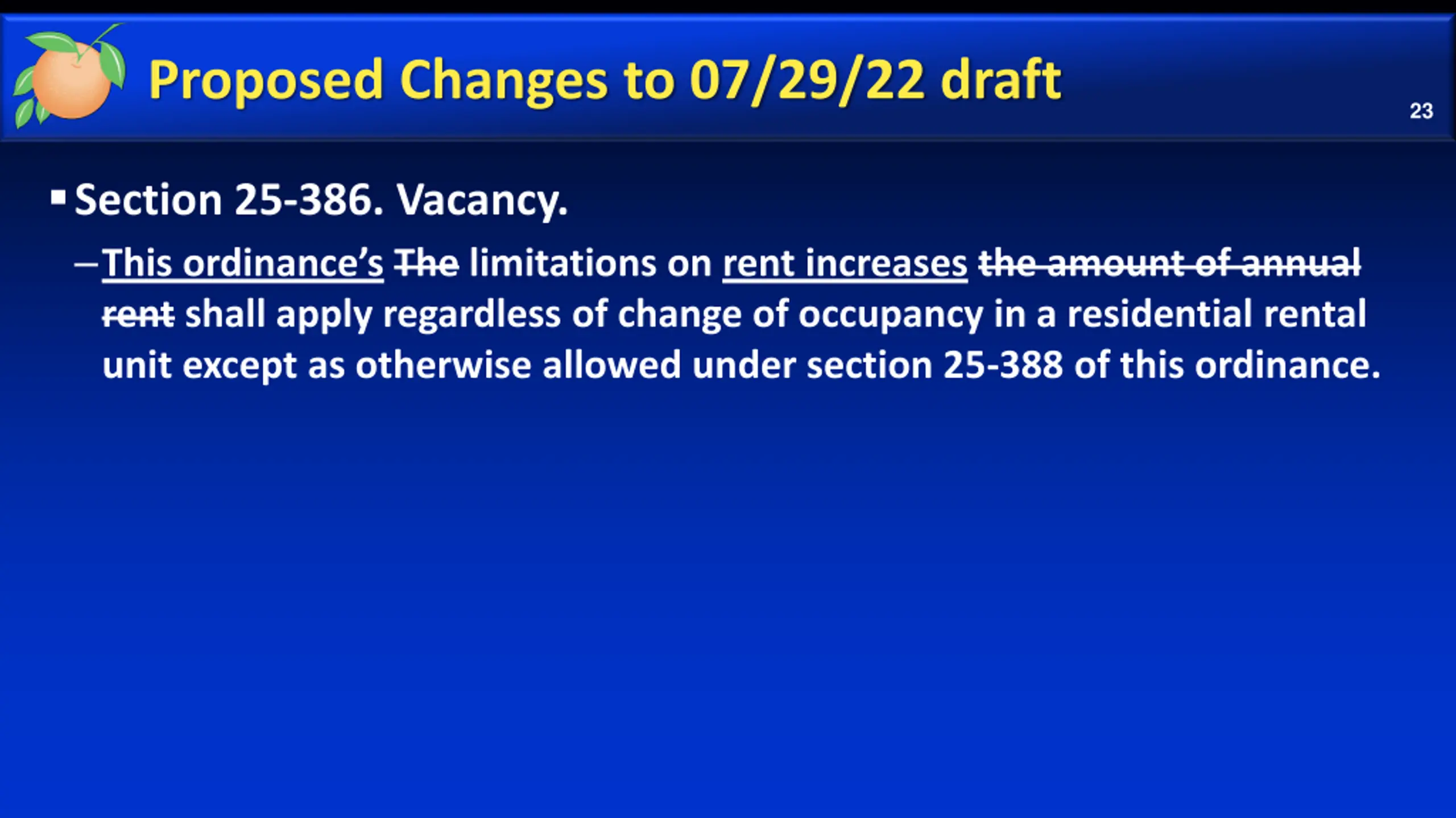 Proposed Changes to 07/29/22 draft 23 Section 25-386. Vacancy. This ordinance s The limitations on rent increases the amount of annual rent shall apply regardless of change of occupancy in a residential rental unit except as otherwise allowed under section 25-388 of this ordinance.
