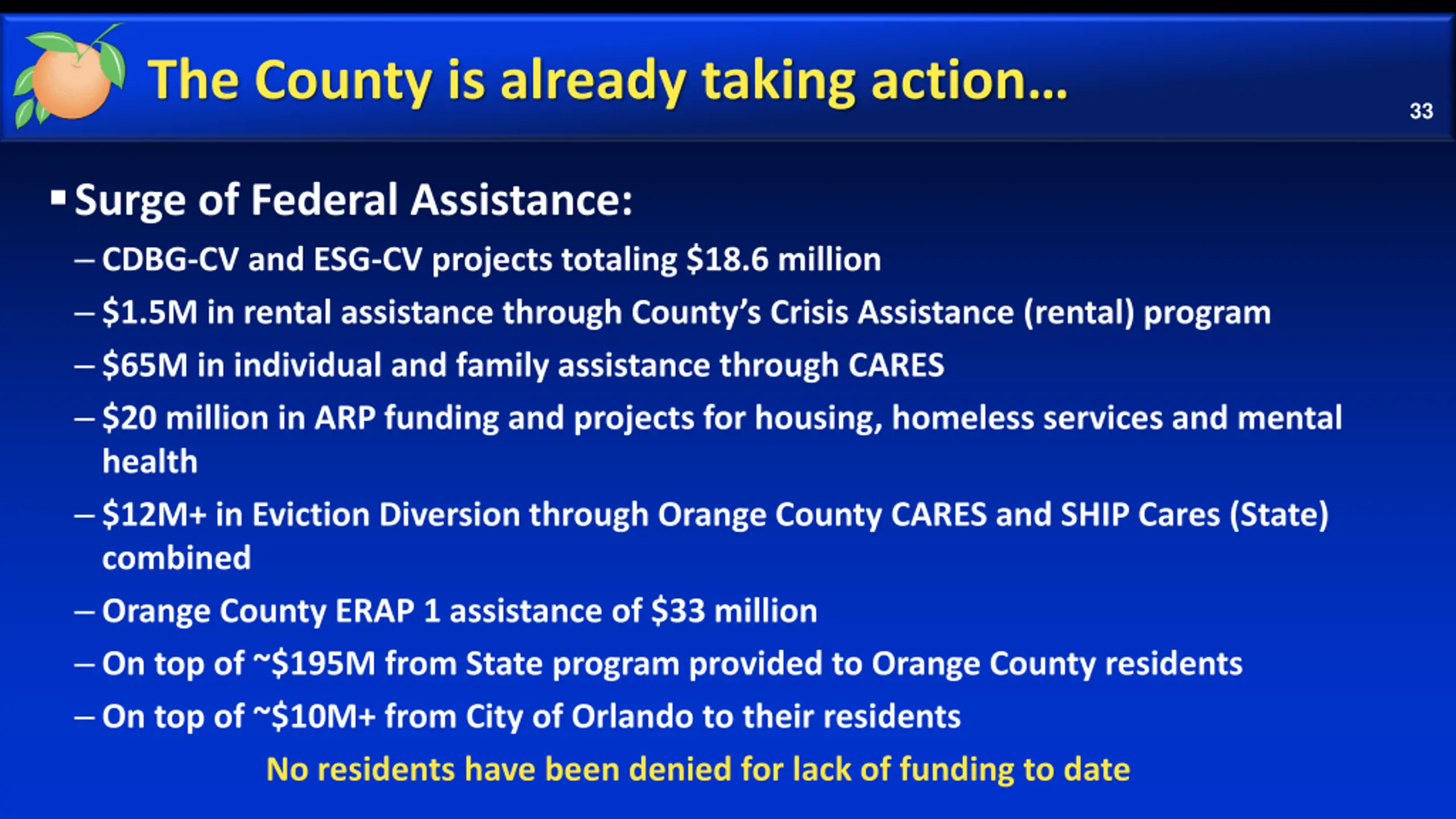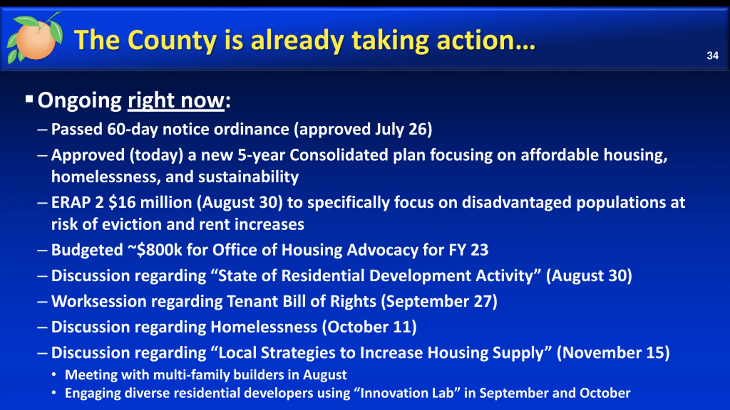 The County is already taking action 33 Surge of Federal Assistance: CDBG-CV and ESG-CV projects totaling $18.6 million $1.5M in rental assistance through County s Crisis Assistance (rental) program $65M in individual and family assistance through CARES $20 million in ARP funding and projects for housing, homeless services and mental health $12M+ in Eviction Diversion through Orange County CARES and SHIP Cares (State) combined Orange County ERAP 1 assistance of $33 million On top of ~$195M from State program provided to Orange County residents On top of ~$10M+ from City of Orlando to their residents No residents have been denied for lack of funding to date