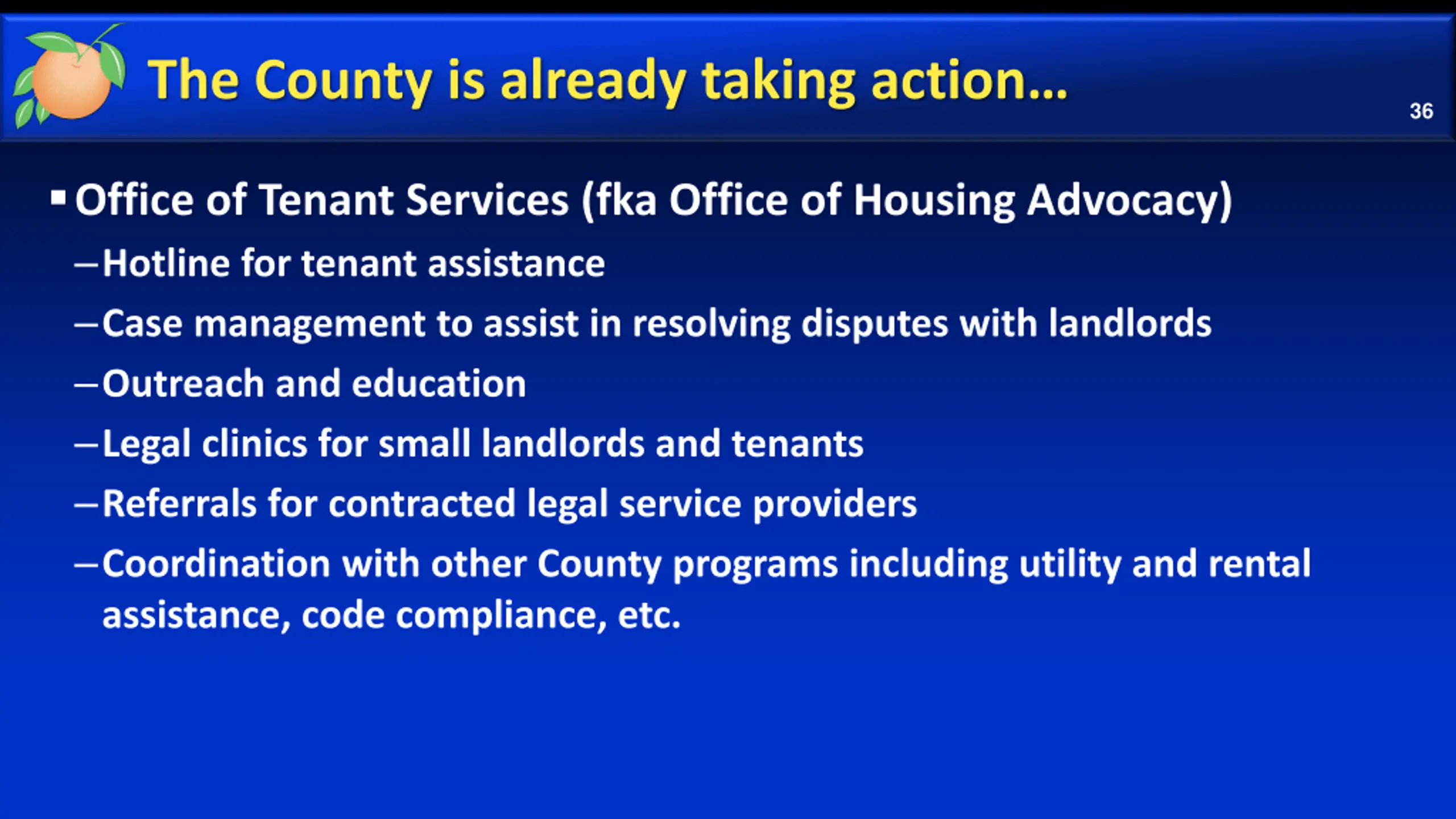 The County is already taking action 35 DRAFT Scope of Tenant Bill of Rights: Distribution and signature for Tenant Bill of Rights Notice requirements for material changes to agreements Minimum building conditions Ability to deduct repairs from rent Discrimination prohibitions including source of income and eviction history Fee disclosure, late fee regulations, and security deposit return Prohibited landlord actions Freedom from retaliatory conduct Challenge to evictions and other unlawful acts with court relief