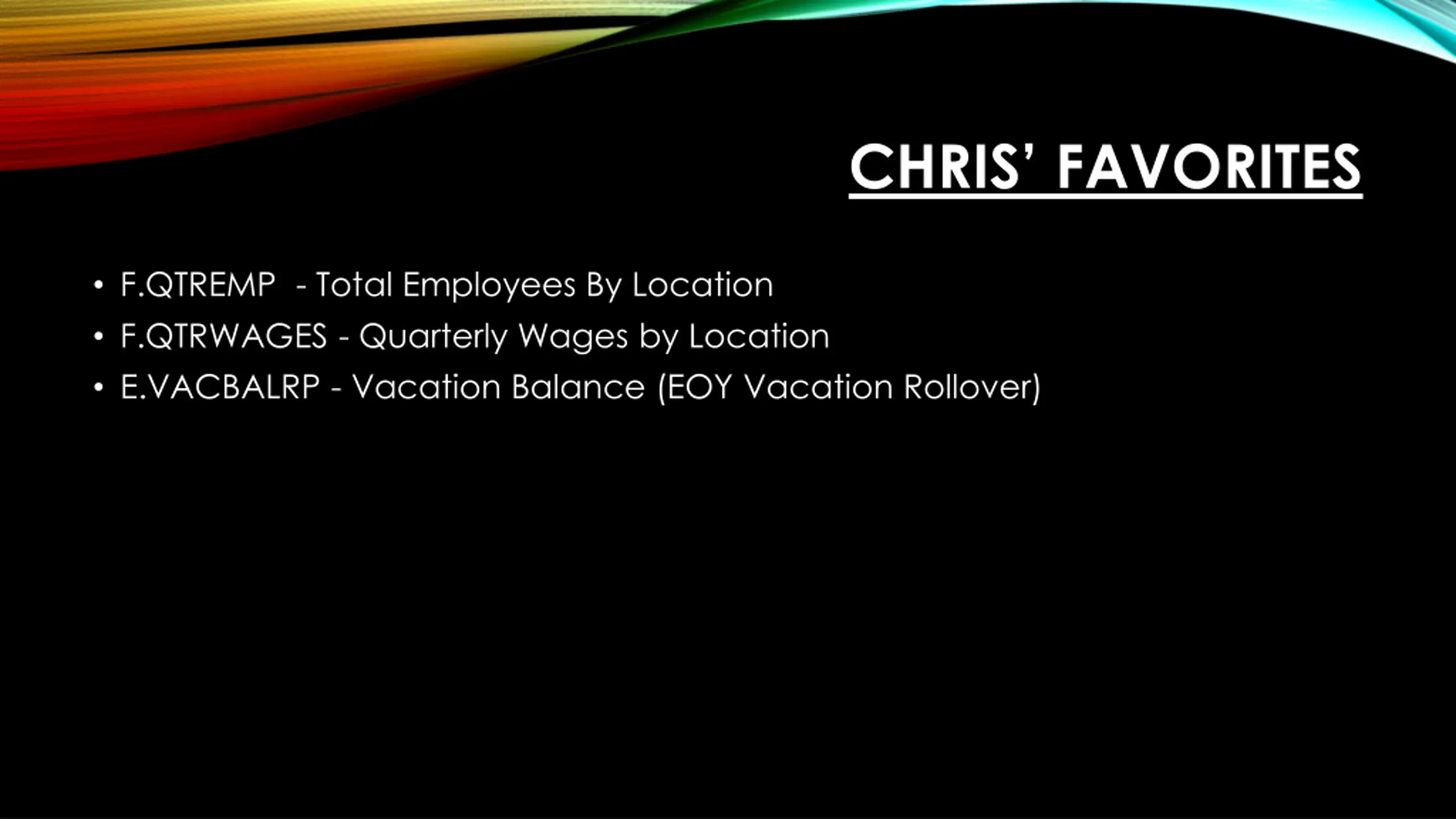 CHRIS FAVORITES F.QTREMP - Total Employees By Location F.QTRWAGES - Quarterly Wages by Location E.VACBALRP - Vacation Balance (EOY Vacation Rollover)