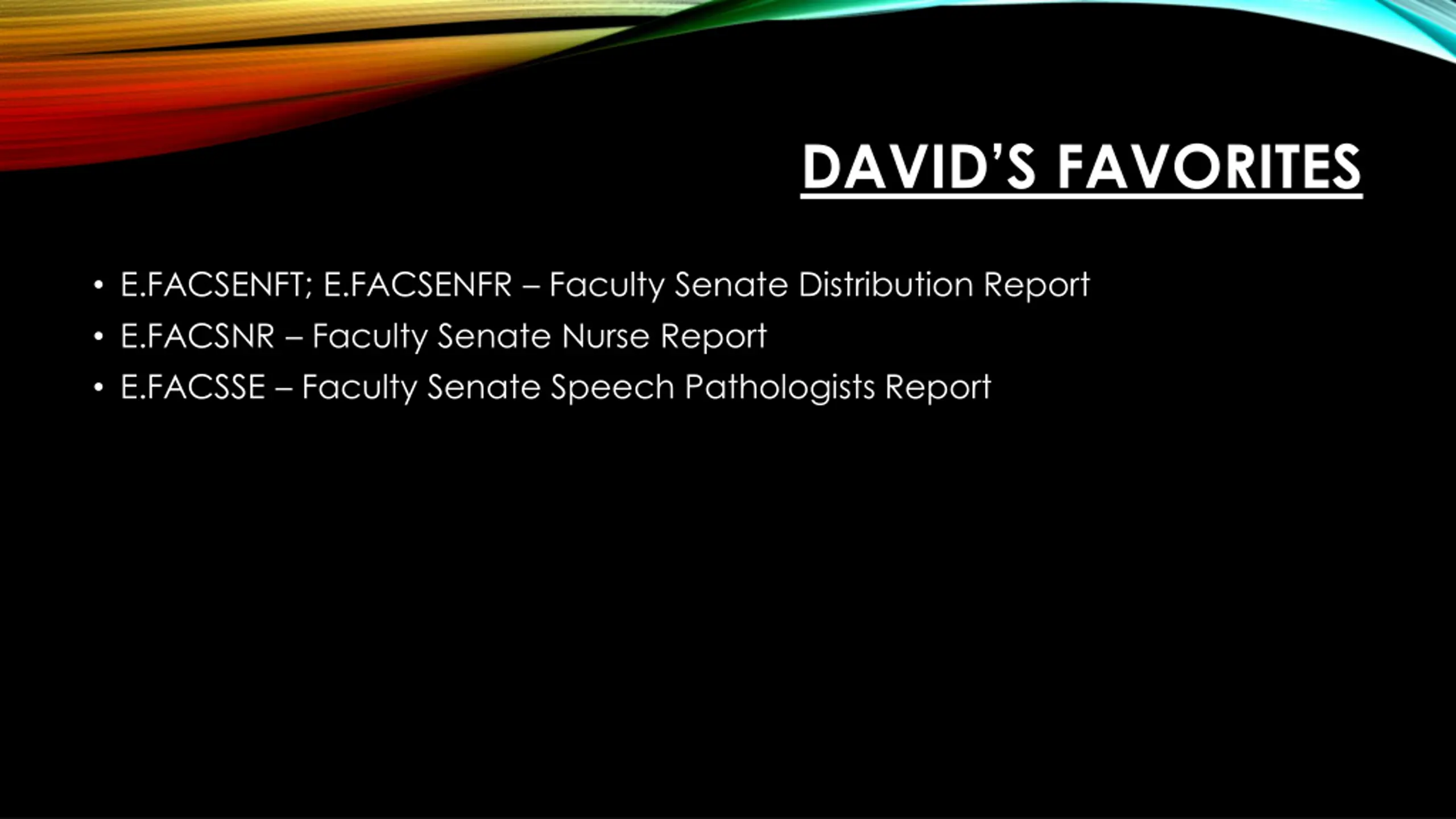 DAVIDS FAVORITES E.FACSENFT; E.FACSENFR Faculty Senate Distribution Report E.FACSNR Faculty Senate Nurse Report E.FACSSE Faculty Senate Speech Pathologists Report