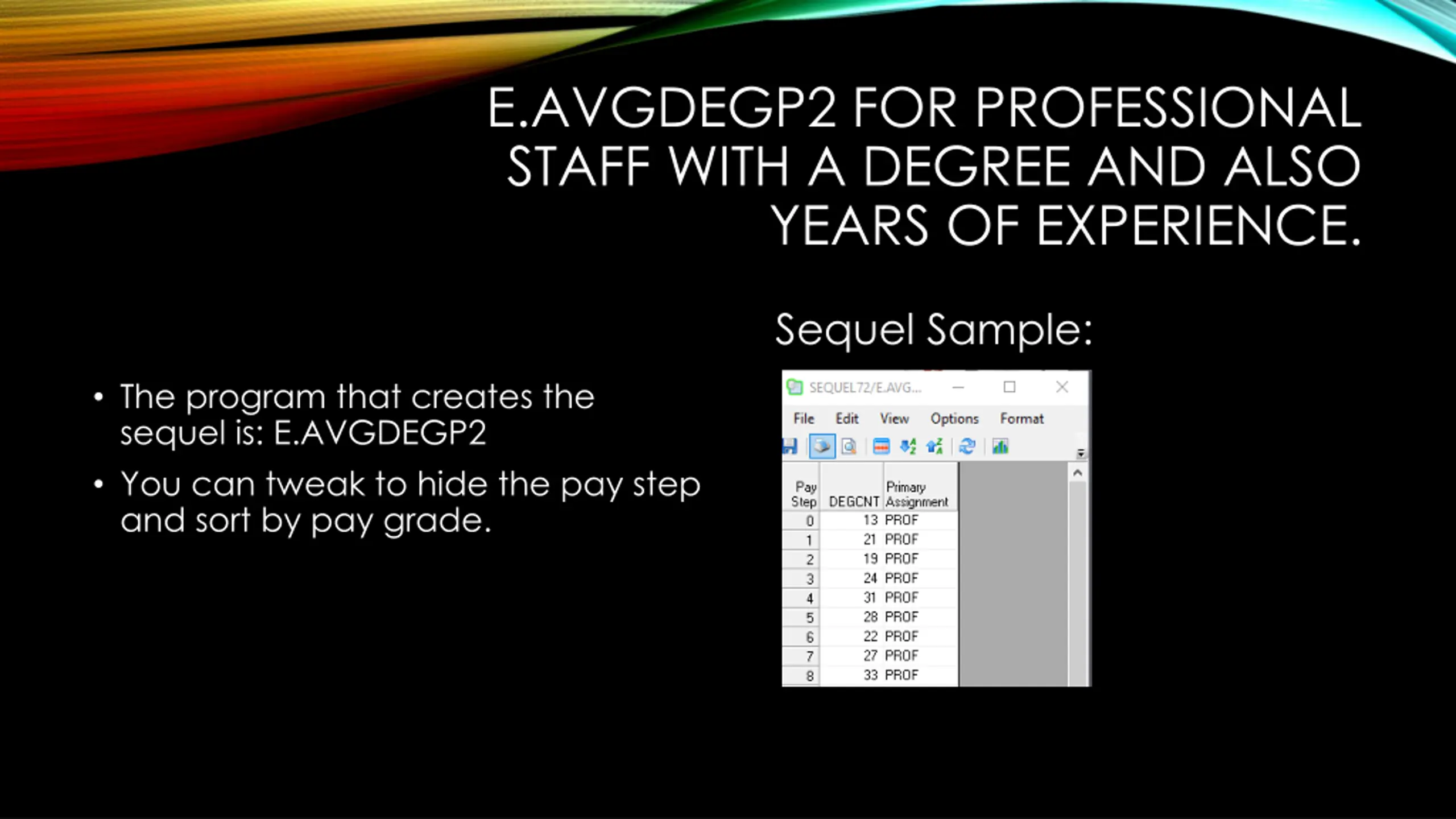 E.AVGDEGP2 FOR PROFESSIONAL STAFF WITH A DEGREE AND ALSO YEARS OF EXPERIENCE. Sequel Sample: The program that creates the sequel is: E.AVGDEGP2 You can tweak to hide the pay step and sort by pay grade.