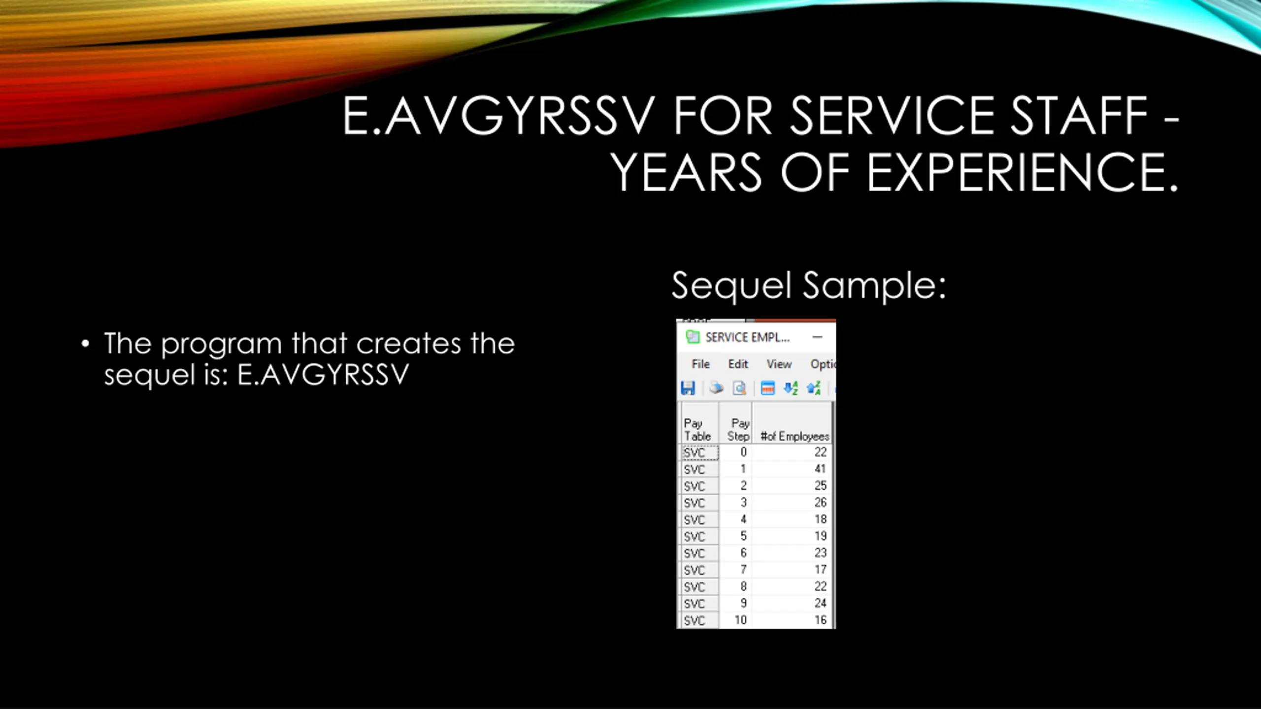 E.AVGYRSSV FOR SERVICE STAFF - YEARS OF EXPERIENCE. Sequel Sample: The program that creates the sequel is: E.AVGYRSSV