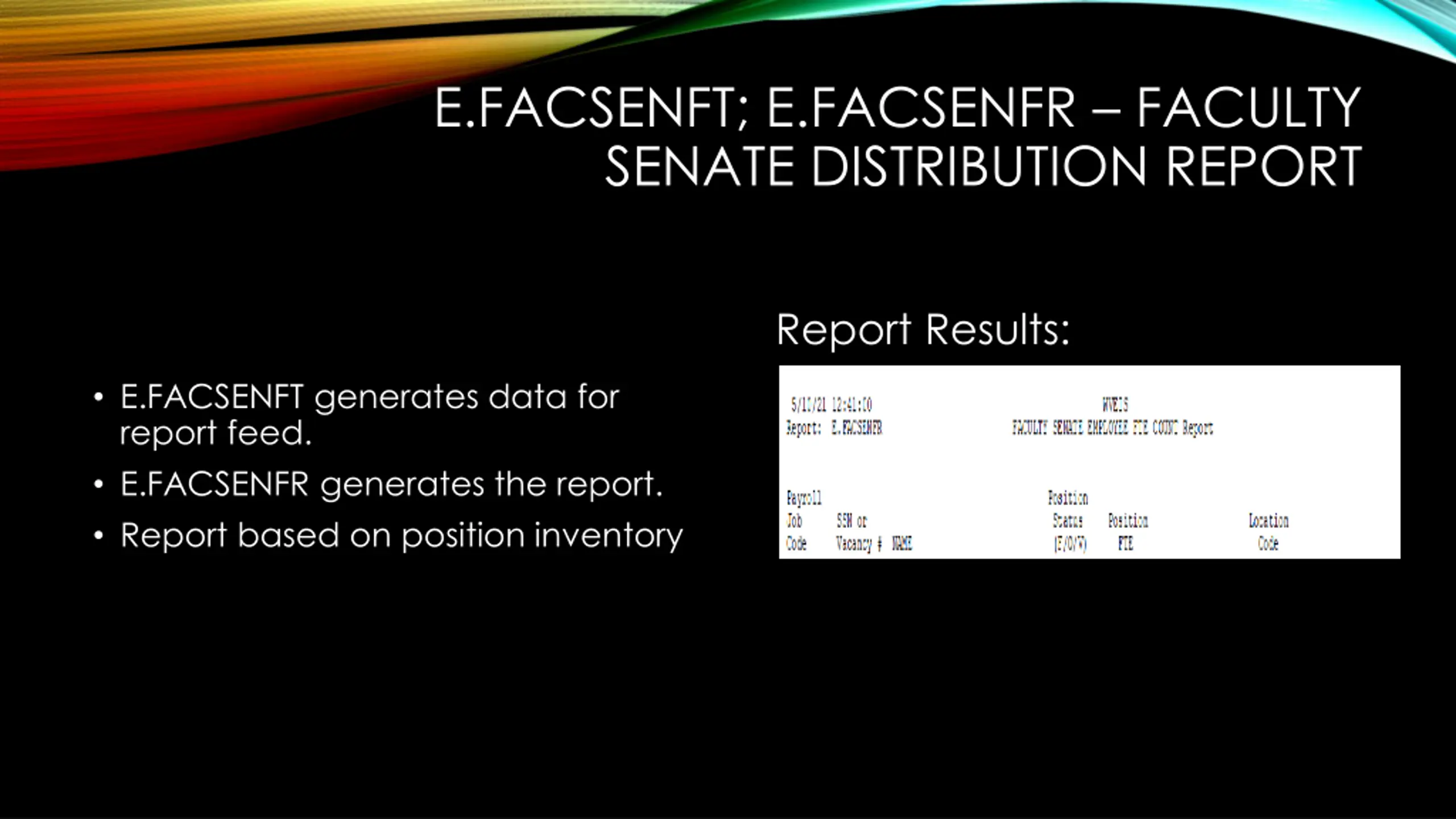 E.FACSENFT; E.FACSENFR FACULTY SENATE DISTRIBUTION REPORT Report Results: E.FACSENFT generates data for report feed. E.FACSENFR generates the report. Report based on position inventory