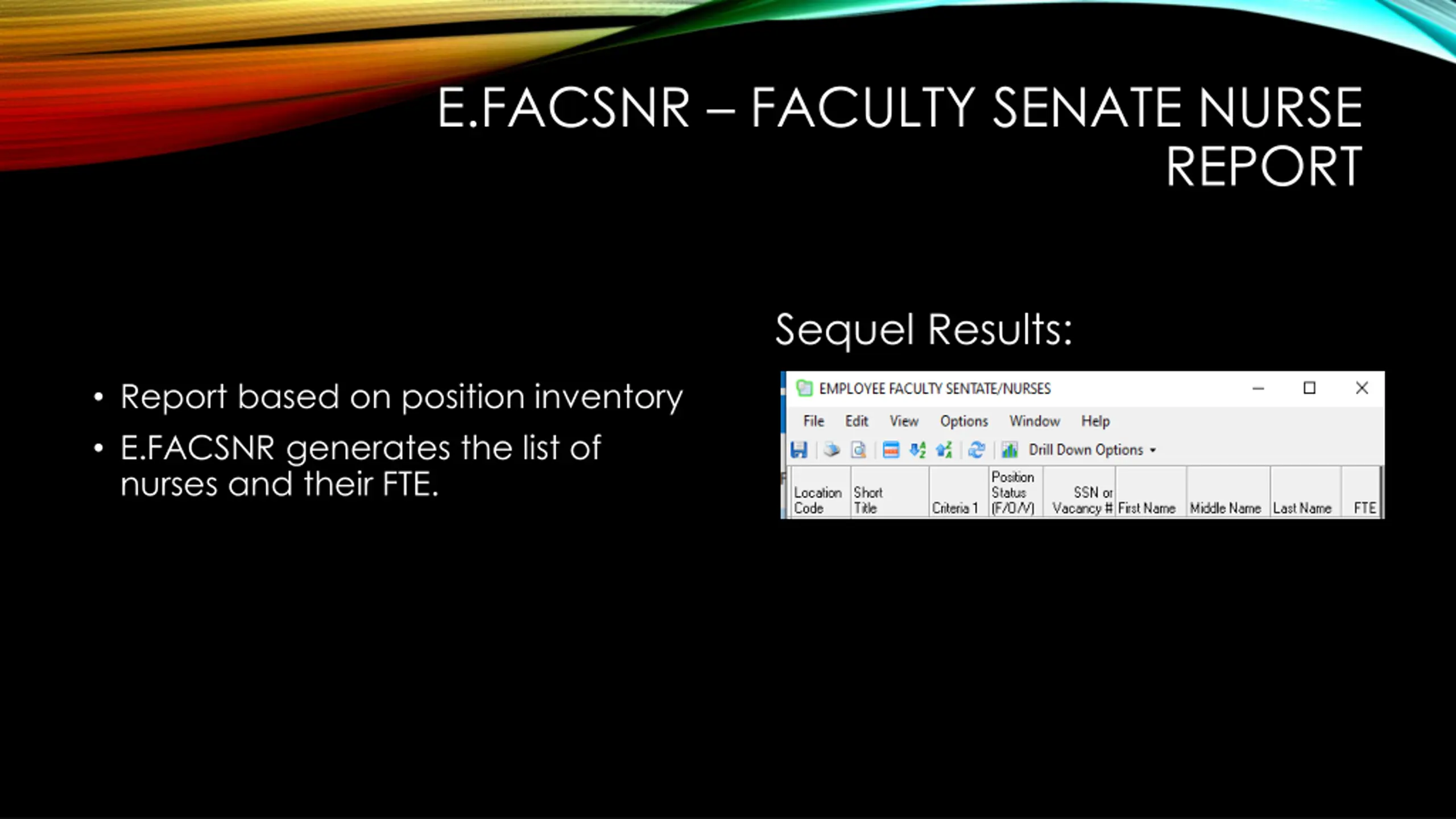 E.FACSNR FACULTY SENATE NURSE REPORT Sequel Results: Report based on position inventory E.FACSNR generates the list of nurses and their FTE.