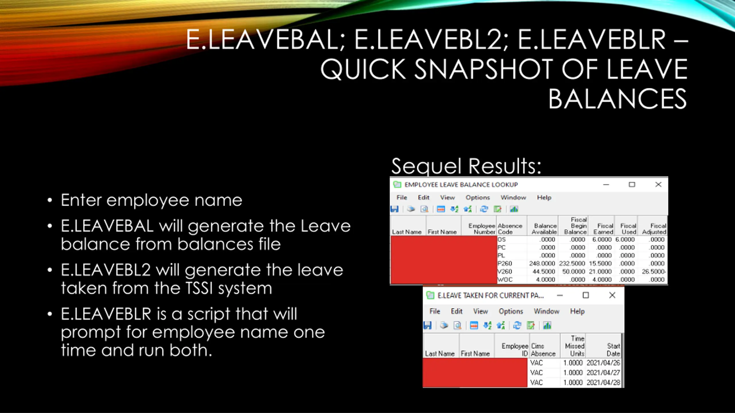 E.LEAVEBAL; E.LEAVEBL2; E.LEAVEBLR QUICK SNAPSHOT OF LEAVE BALANCES Sequel Results: Enter employee name E.LEAVEBAL will generate the Leave balance from balances file E.LEAVEBL2 will generate the leave taken from the TSSI system E.LEAVEBLR is a script that will prompt for employee name one time and run both.