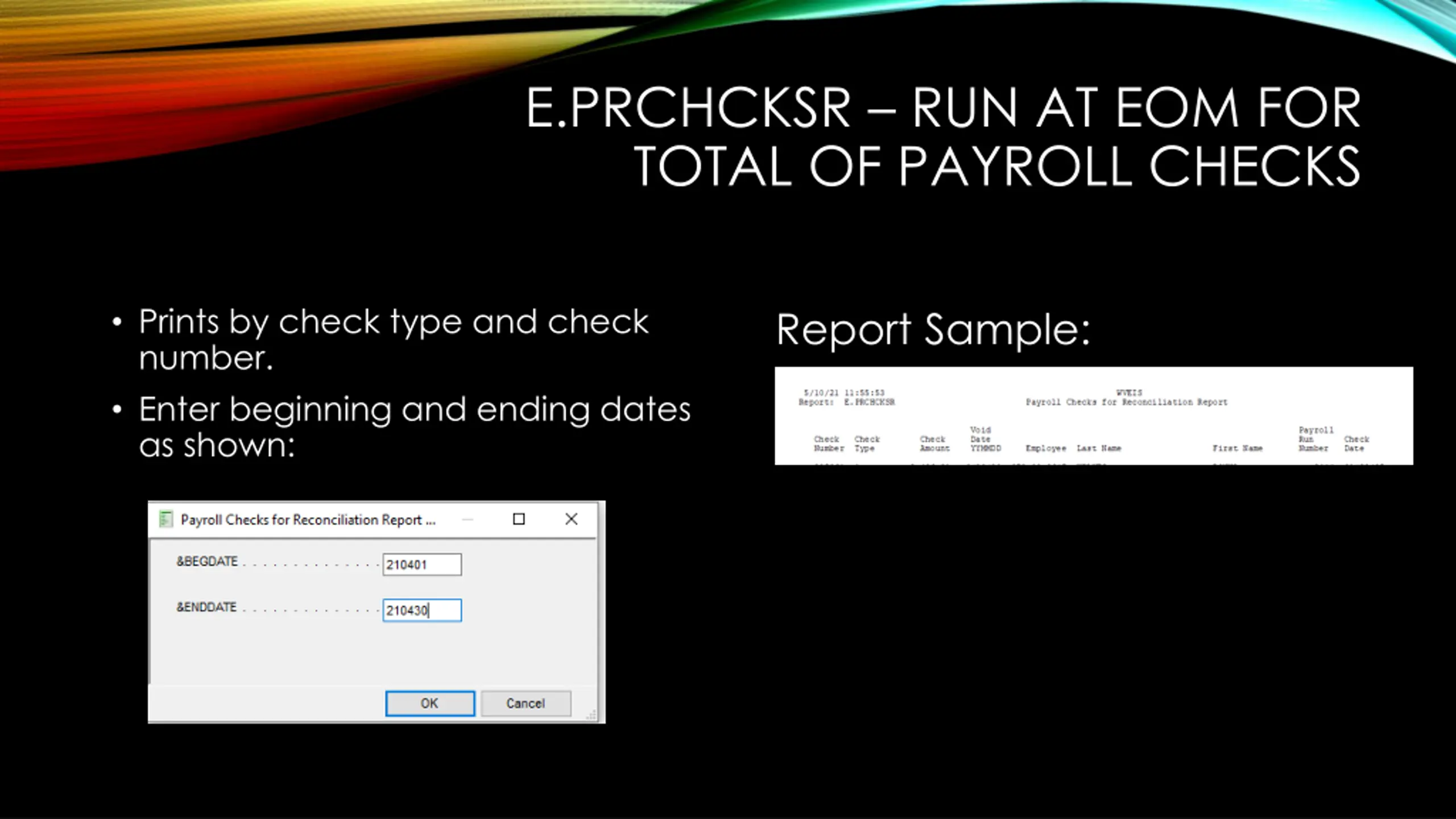 E.PRCHCKSR RUN AT EOM FOR TOTAL OF PAYROLL CHECKS Prints by check type and check number. Enter beginning and ending dates as shown: Report Sample: