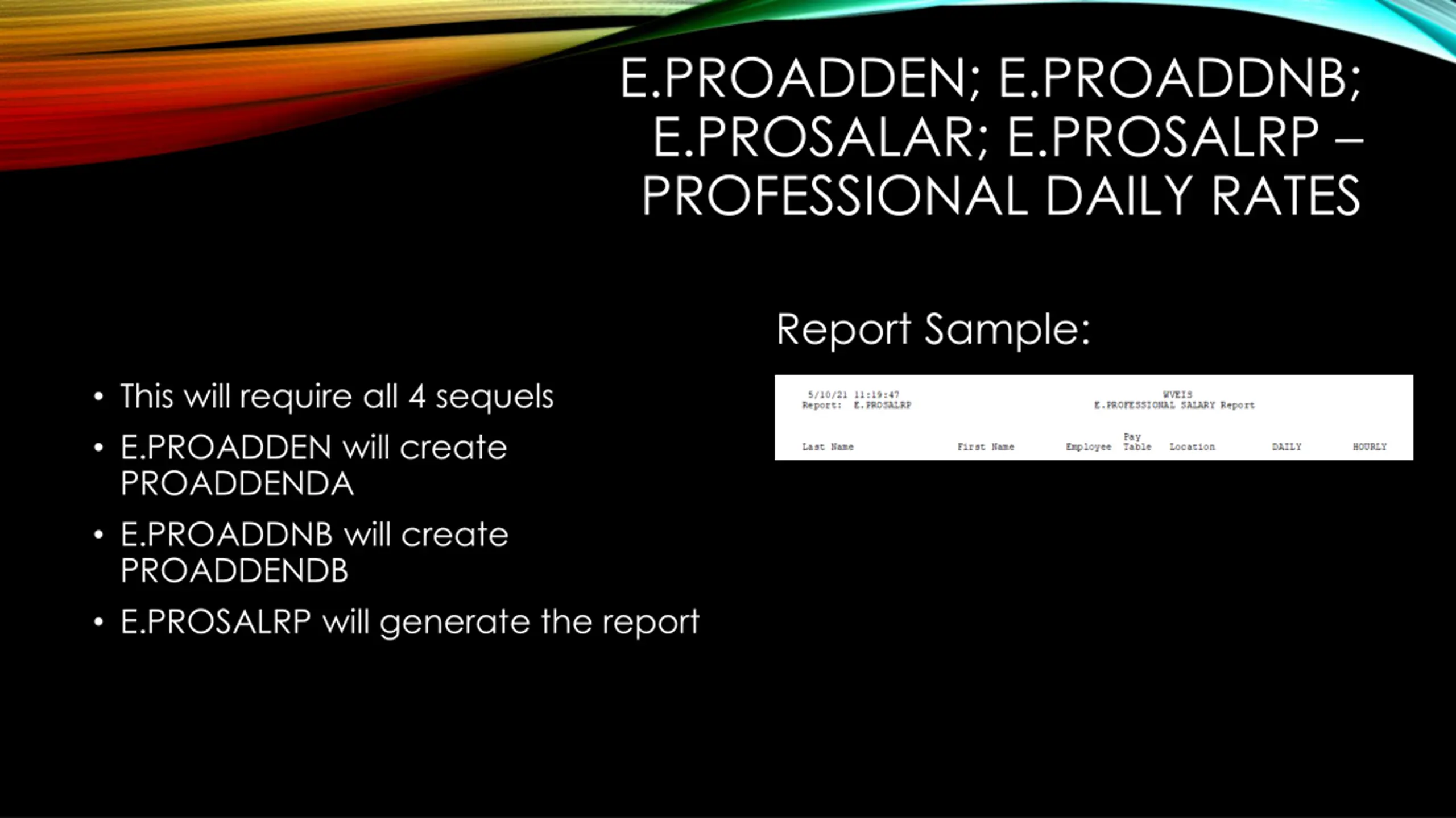 E.PROADDEN; E.PROADDNB; E.PROSALAR; E.PROSALRP PROFESSIONAL DAILY RATES Report Sample: This will require all 4 sequels E.PROADDEN will create PROADDENDA E.PROADDNB will create PROADDENDB E.PROSALRP will generate the report