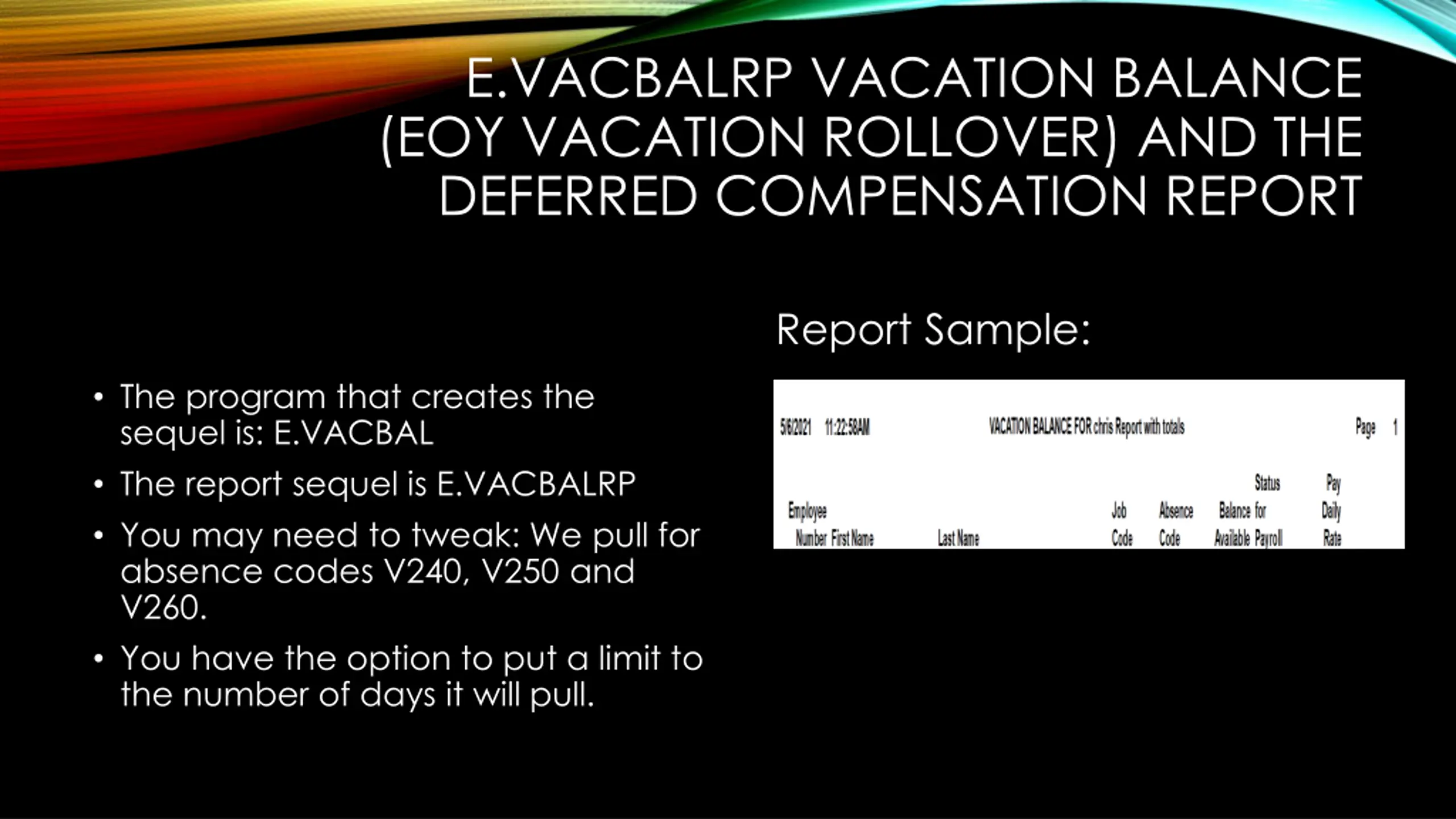 E.VACBALRP VACATION BALANCE (EOY VACATION ROLLOVER) AND THE DEFERRED COMPENSATION REPORT Report Sample: The program that creates the sequel is: E.VACBAL The report sequel is E.VACBALRP You may need to tweak: We pull for absence codes V240, V250 and V260. You have the option to put a limit to the number of days it will pull.