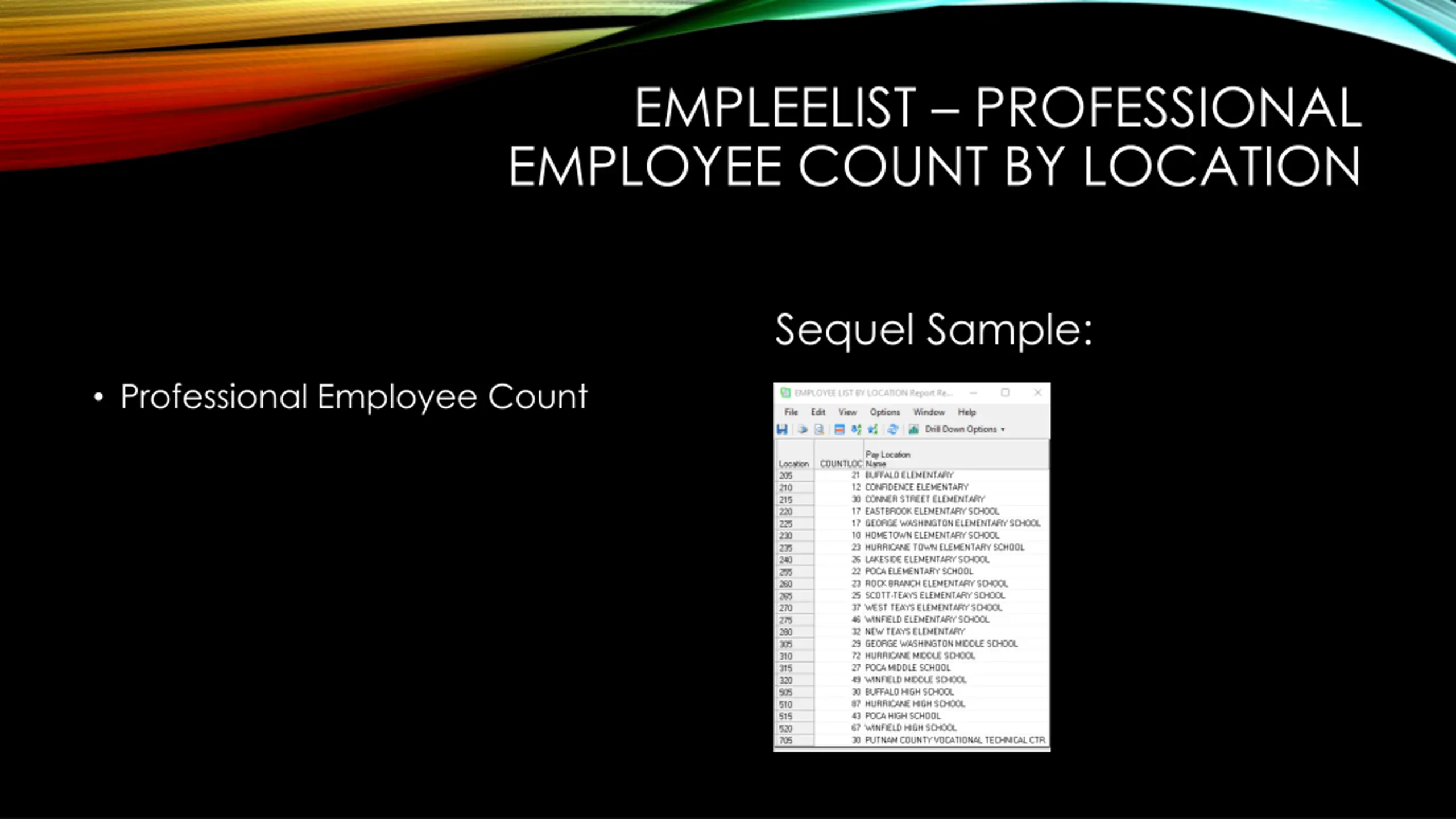 EMPLEELIST PROFESSIONAL EMPLOYEE COUNT BY LOCATION Sequel Sample: Professional Employee Count