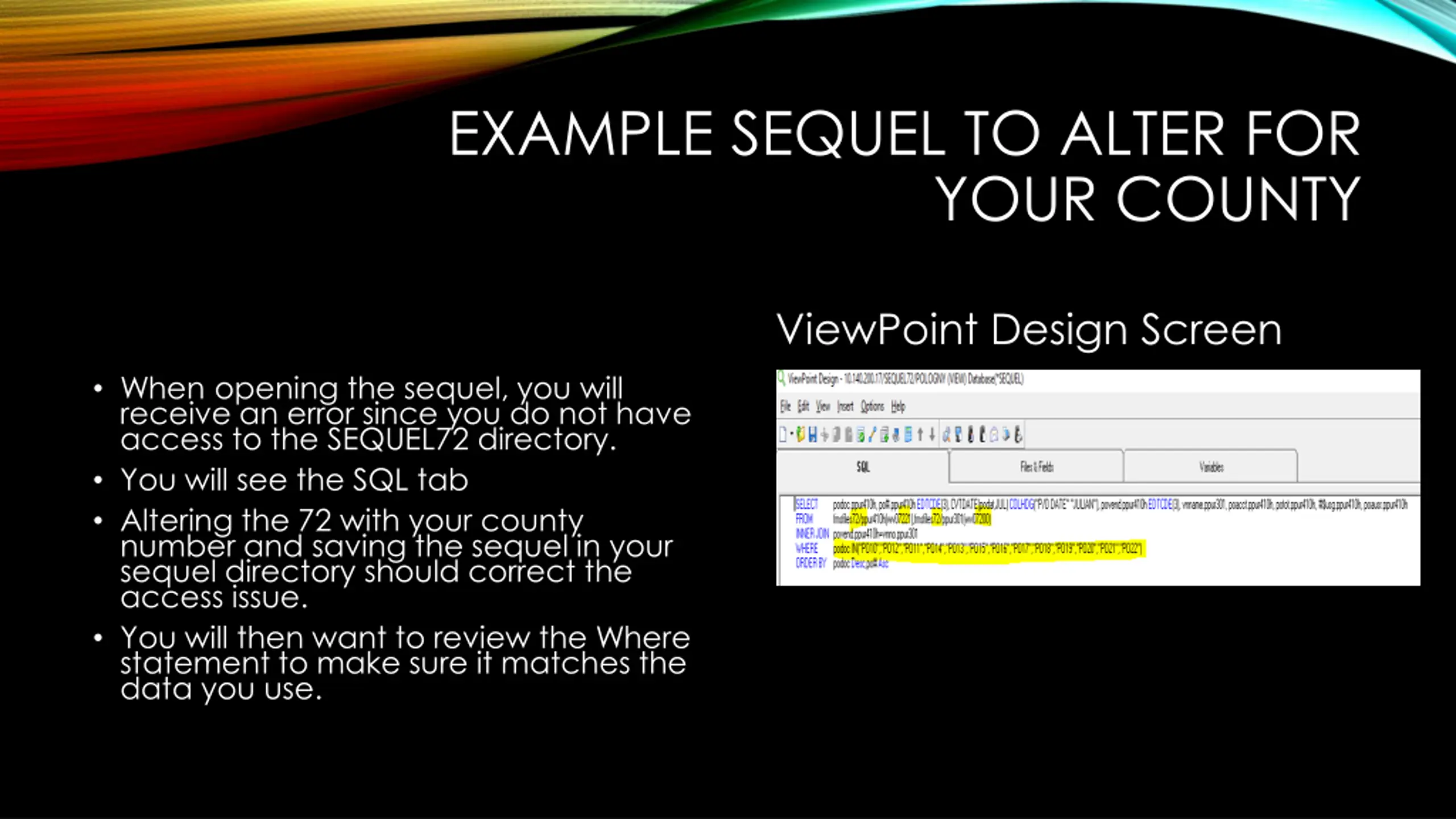 EXAMPLE SEQUEL TO ALTER FOR YOUR COUNTY ViewPoint Design Screen When opening the sequel, you will receive an error since you do not have access to the SEQUEL72 directory. You will see the SQL tab Altering the 72 with your county number and saving the sequel in your sequel directory should correct the access issue. You will then want to review the Where statement to make sure it matches the data you use.