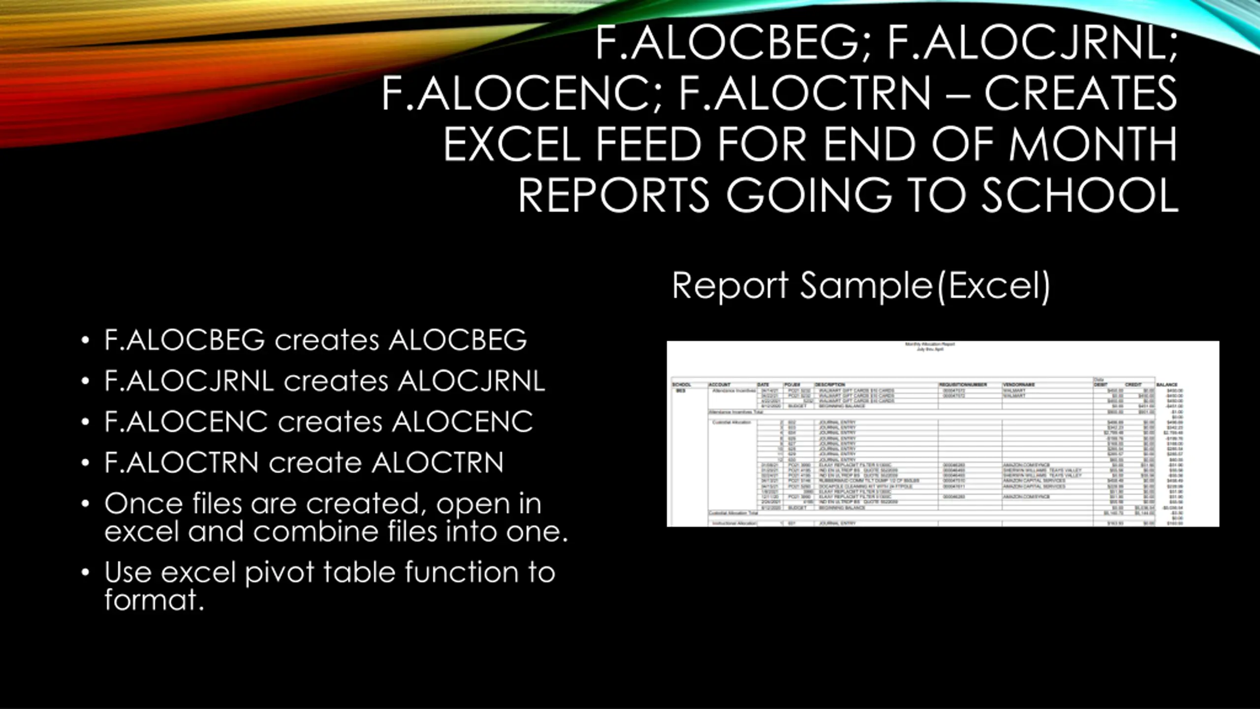 F.ALOCBEG; F.ALOCJRNL; F.ALOCENC; F.ALOCTRN CREATES EXCEL FEED FOR END OF MONTH REPORTS GOING TO SCHOOL Report Sample(Excel) F.ALOCBEG creates ALOCBEG F.ALOCJRNL creates ALOCJRNL F.ALOCENC creates ALOCENC F.ALOCTRN create ALOCTRN Once files are created, open in excel and combine files into one. Use excel pivot table function to format.