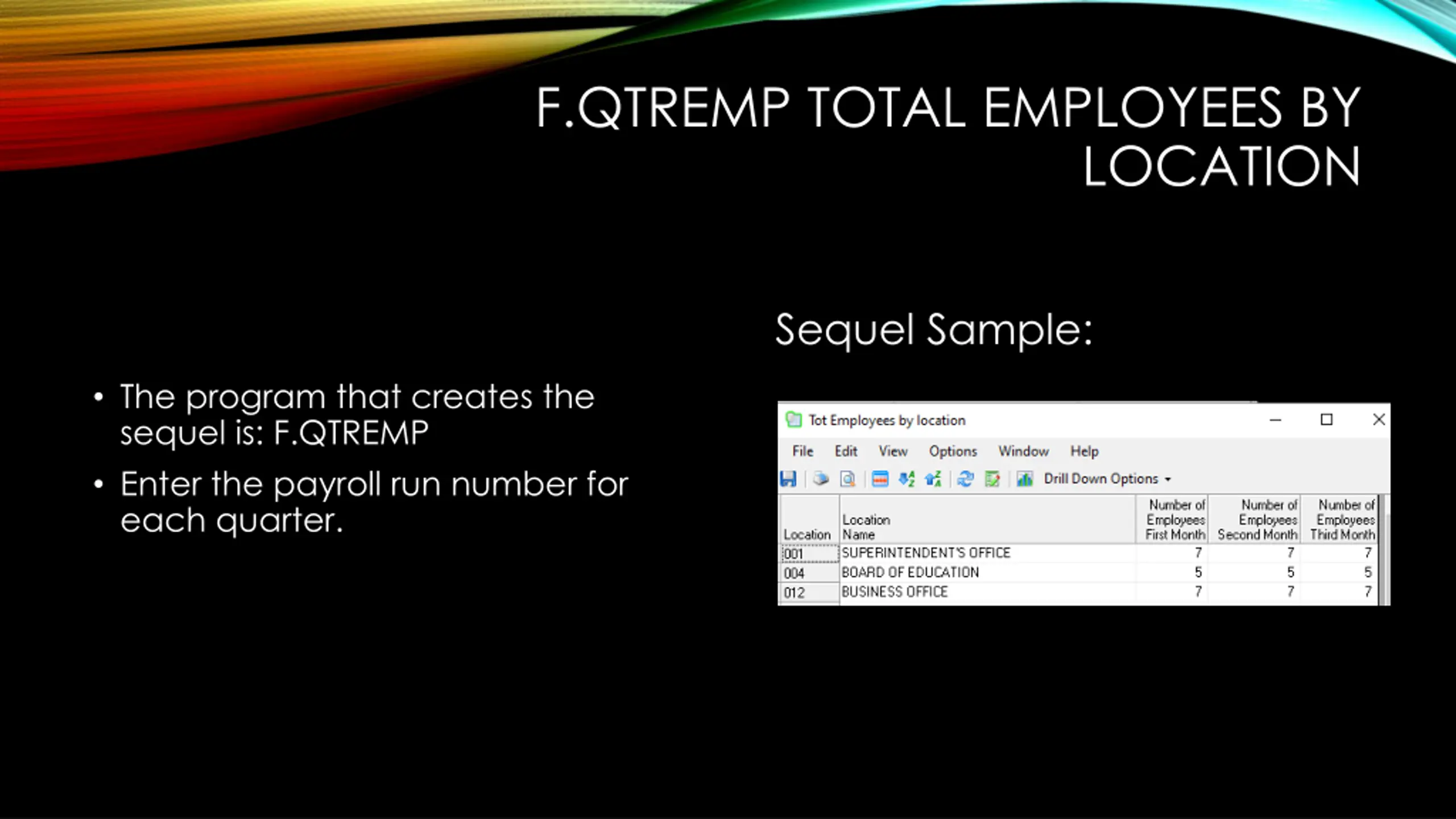 F.QTREMP TOTAL EMPLOYEES BY LOCATION Sequel Sample: The program that creates the sequel is: F.QTREMP Enter the payroll run number for each quarter.