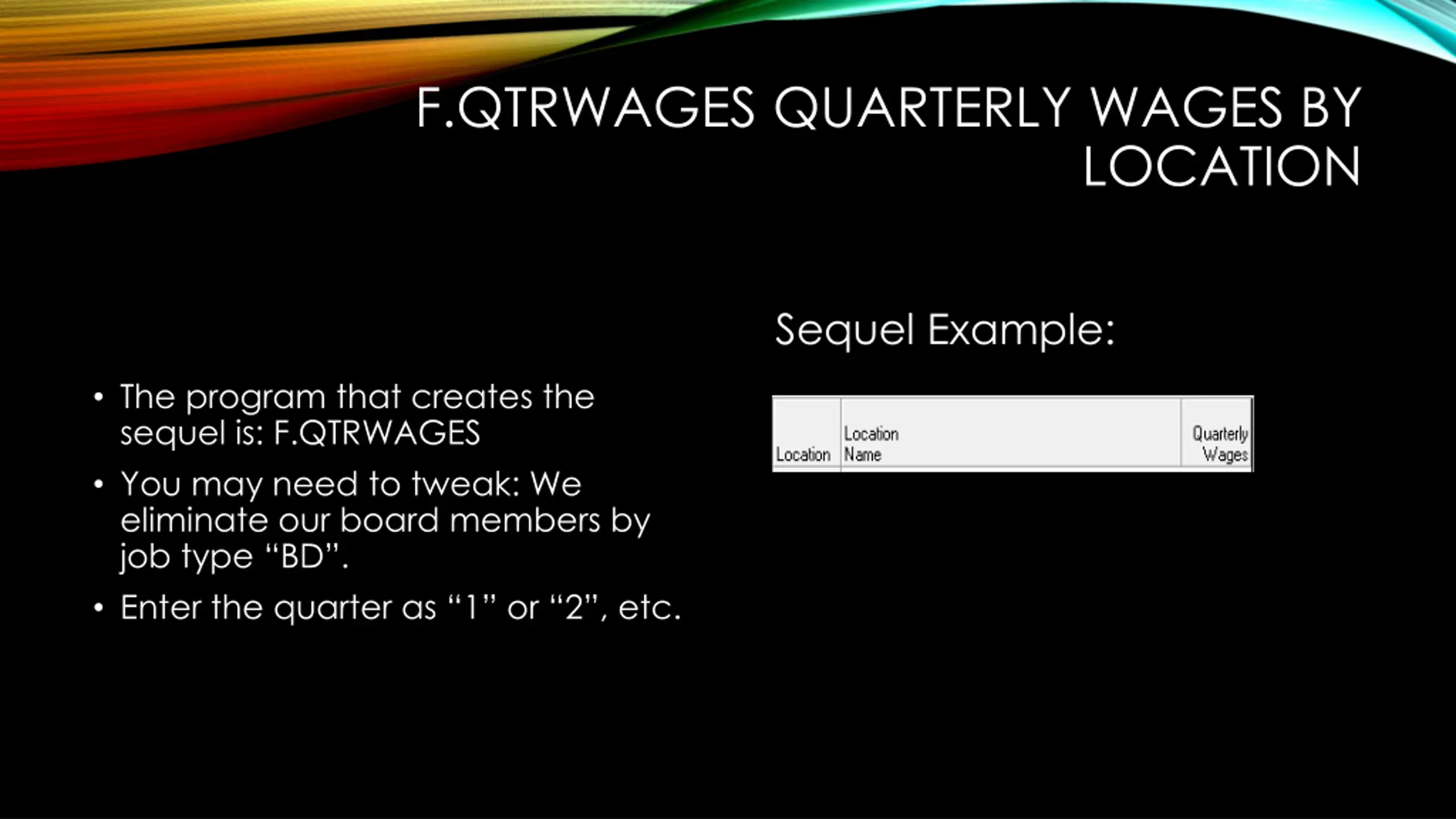 F.QTRWAGES QUARTERLY WAGES BY LOCATION Sequel Example: The program that creates the sequel is: F.QTRWAGES You may need to tweak: We eliminate our board members by job type BD . Enter the quarter as 1 or 2 , etc.