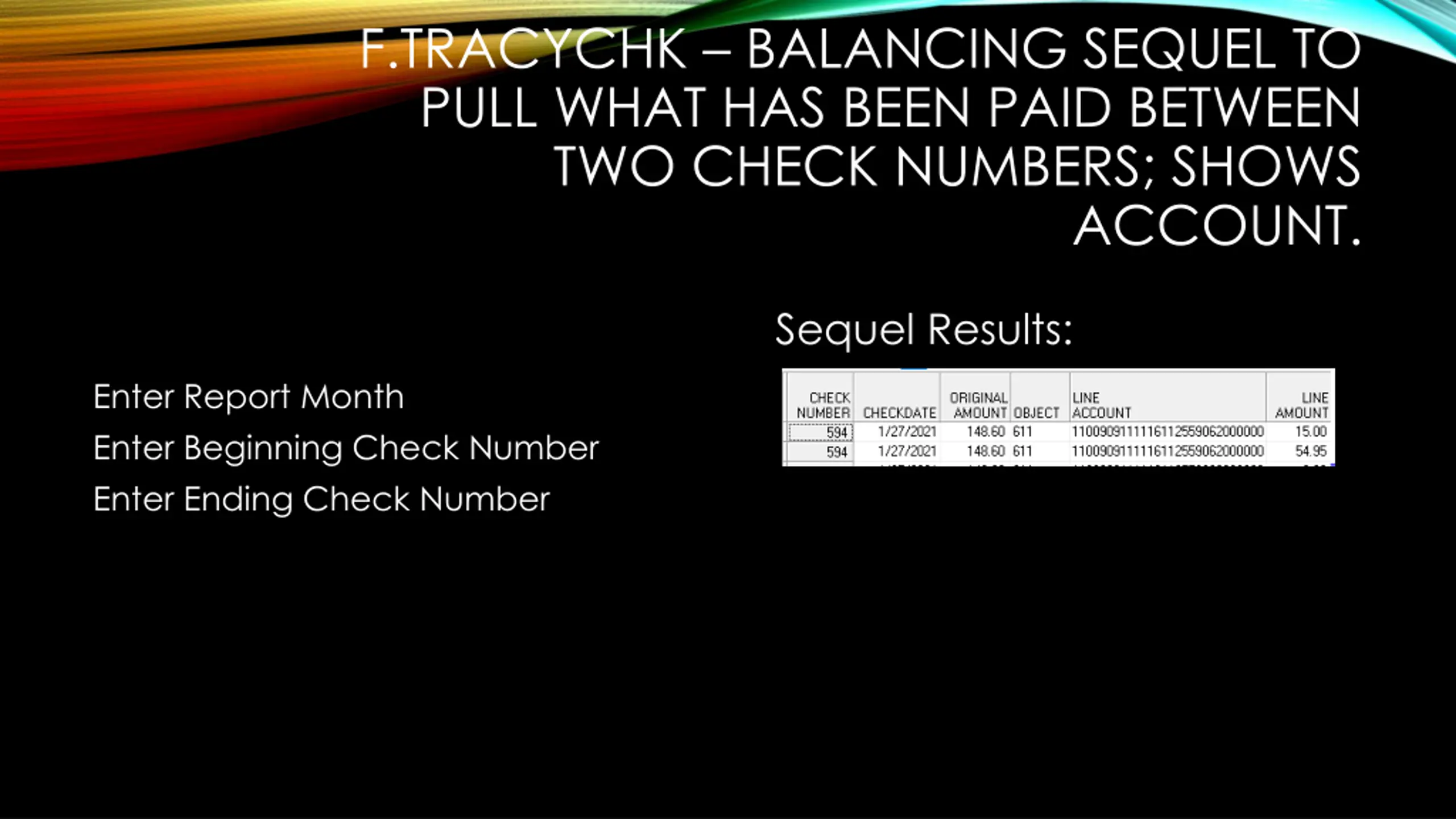 F.TRACYCHK BALANCING SEQUEL TO PULL WHAT HAS BEEN PAID BETWEEN TWO CHECK NUMBERS; SHOWS ACCOUNT. Sequel Results: Enter Report Month Enter Beginning Check Number Enter Ending Check Number