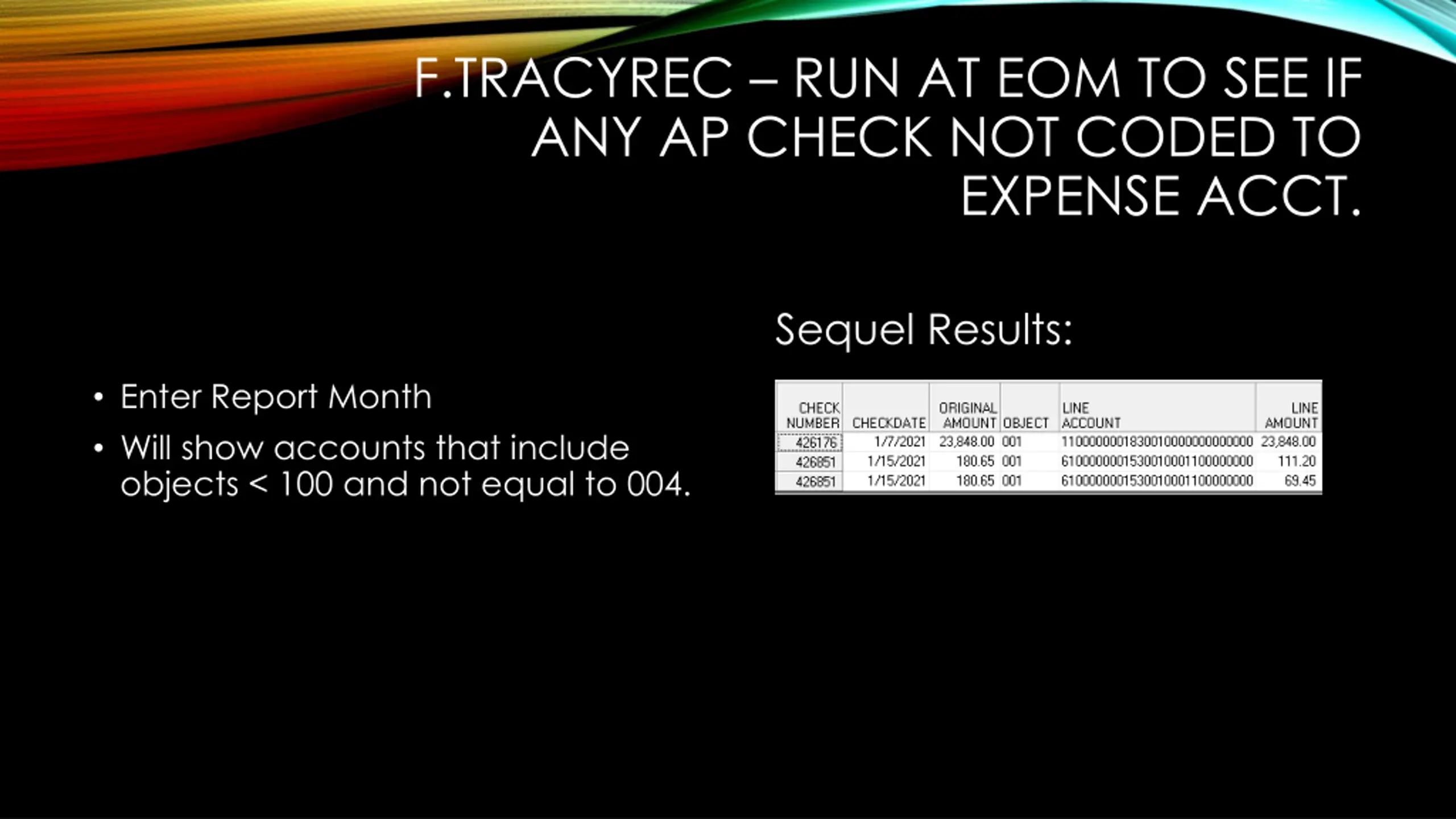 F.TRACYREC RUN AT EOM TO SEE IF ANY AP CHECK NOT CODED TO EXPENSE ACCT. Sequel Results: Enter Report Month Will show accounts that include objects < 100 and not equal to 004.