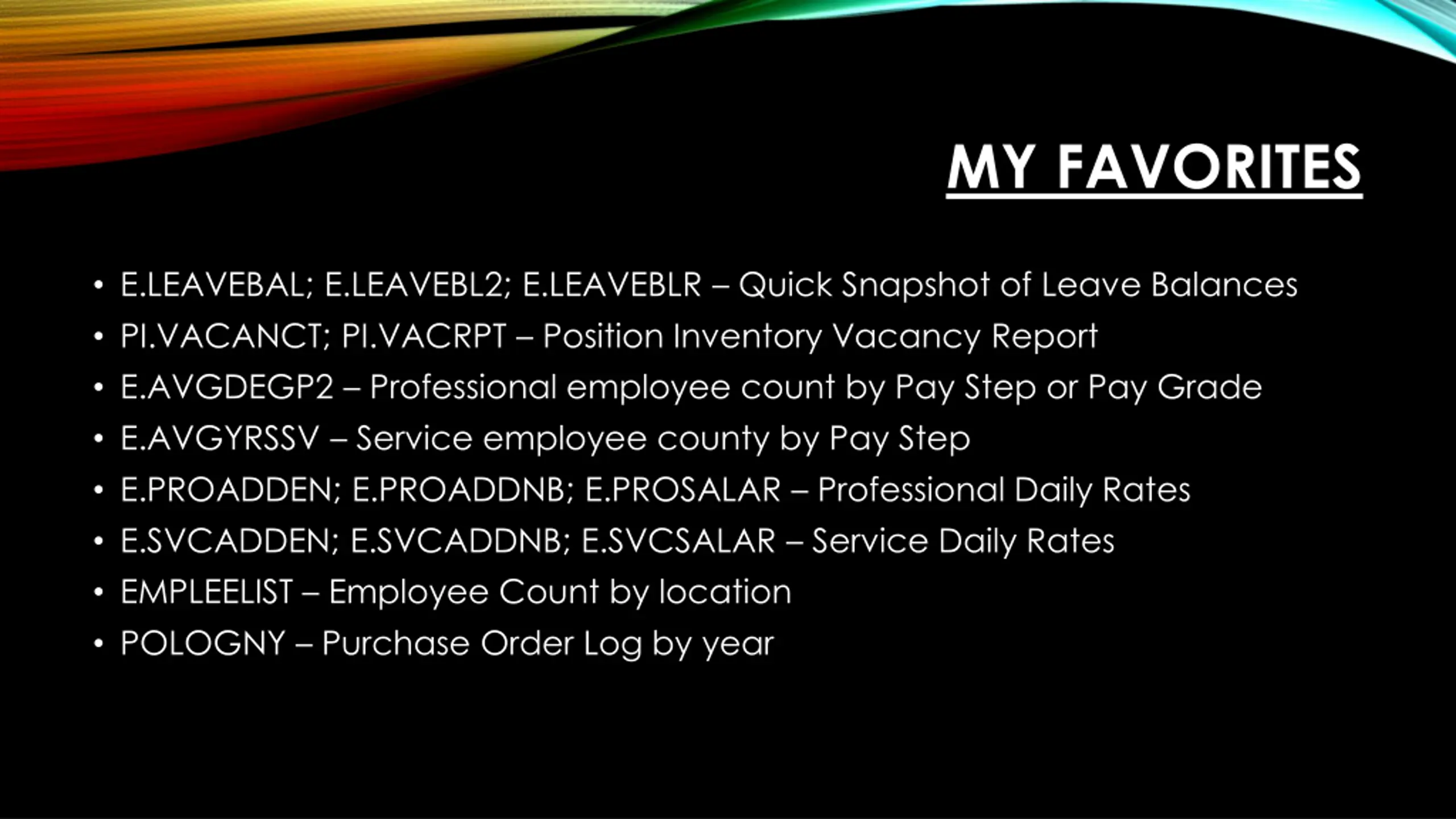 MY FAVORITES E.LEAVEBAL; E.LEAVEBL2; E.LEAVEBLR Quick Snapshot of Leave Balances PI.VACANCT; PI.VACRPT Position Inventory Vacancy Report E.AVGDEGP2 Professional employee count by Pay Step or Pay Grade E.AVGYRSSV Service employee county by Pay Step E.PROADDEN; E.PROADDNB; E.PROSALAR Professional Daily Rates E.SVCADDEN; E.SVCADDNB; E.SVCSALAR Service Daily Rates EMPLEELIST Employee Count by location POLOGNY Purchase Order Log by year