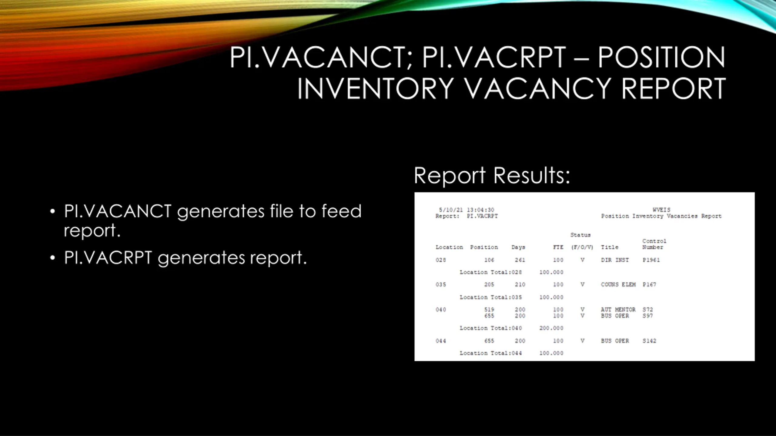 PI.VACANCT; PI.VACRPT POSITION INVENTORY VACANCY REPORT Report Results: PI.VACANCT generates file to feed report. PI.VACRPT generates report.