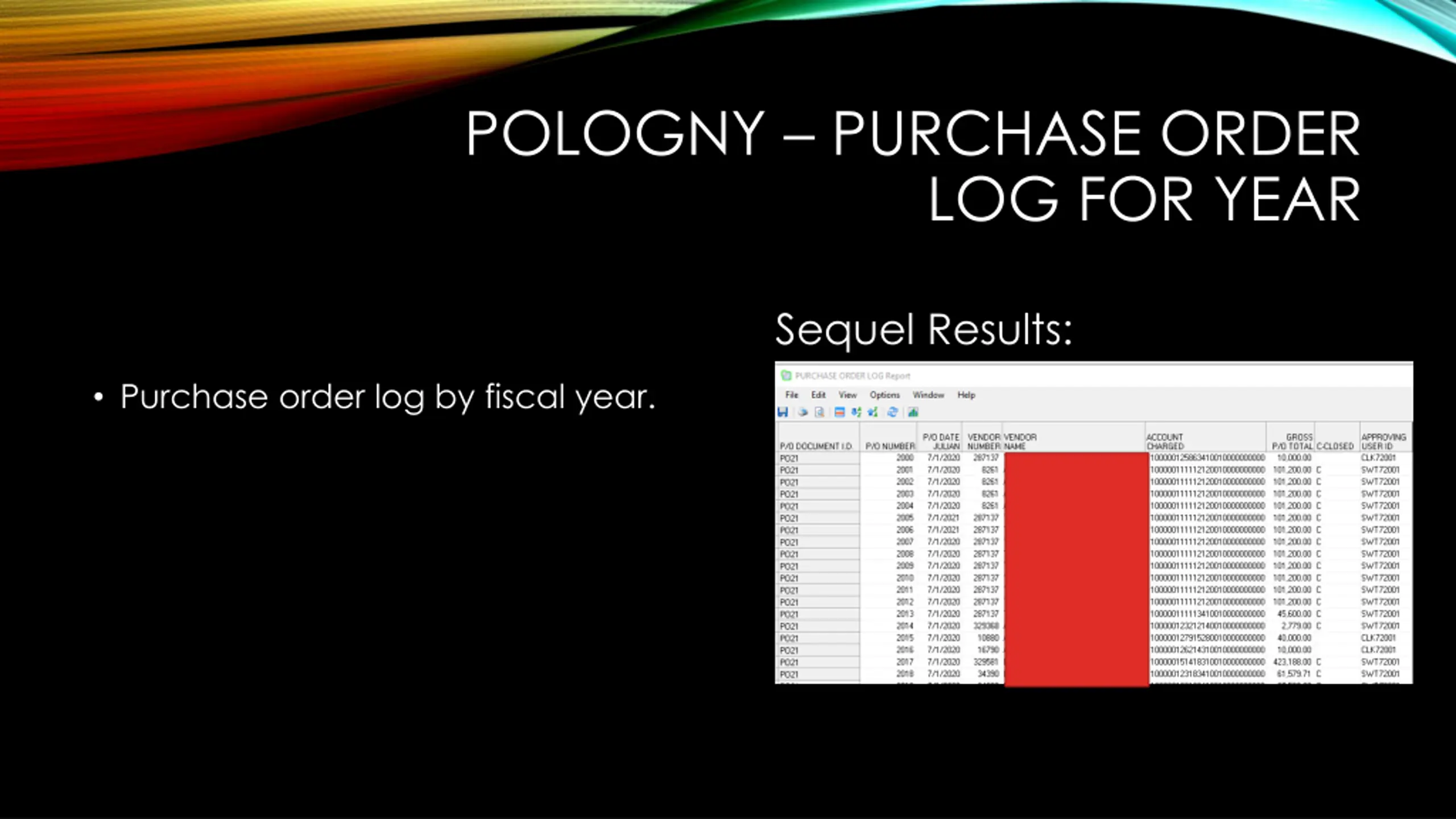 POLOGNY PURCHASE ORDER LOG FOR YEAR Sequel Results: Purchase order log by fiscal year.