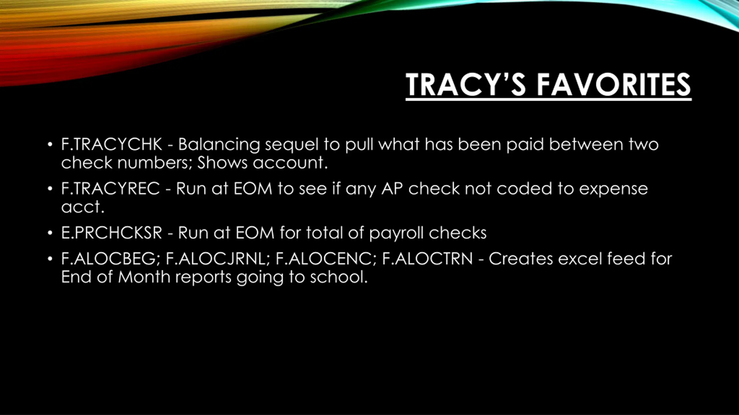 TRACYS FAVORITES F.TRACYCHK - Balancing sequel to pull what has been paid between two check numbers; Shows account. F.TRACYREC - Run at EOM to see if any AP check not coded to expense acct. E.PRCHCKSR - Run at EOM for total of payroll checks F.ALOCBEG; F.ALOCJRNL; F.ALOCENC; F.ALOCTRN - Creates excel feed for End of Month reports going to school.