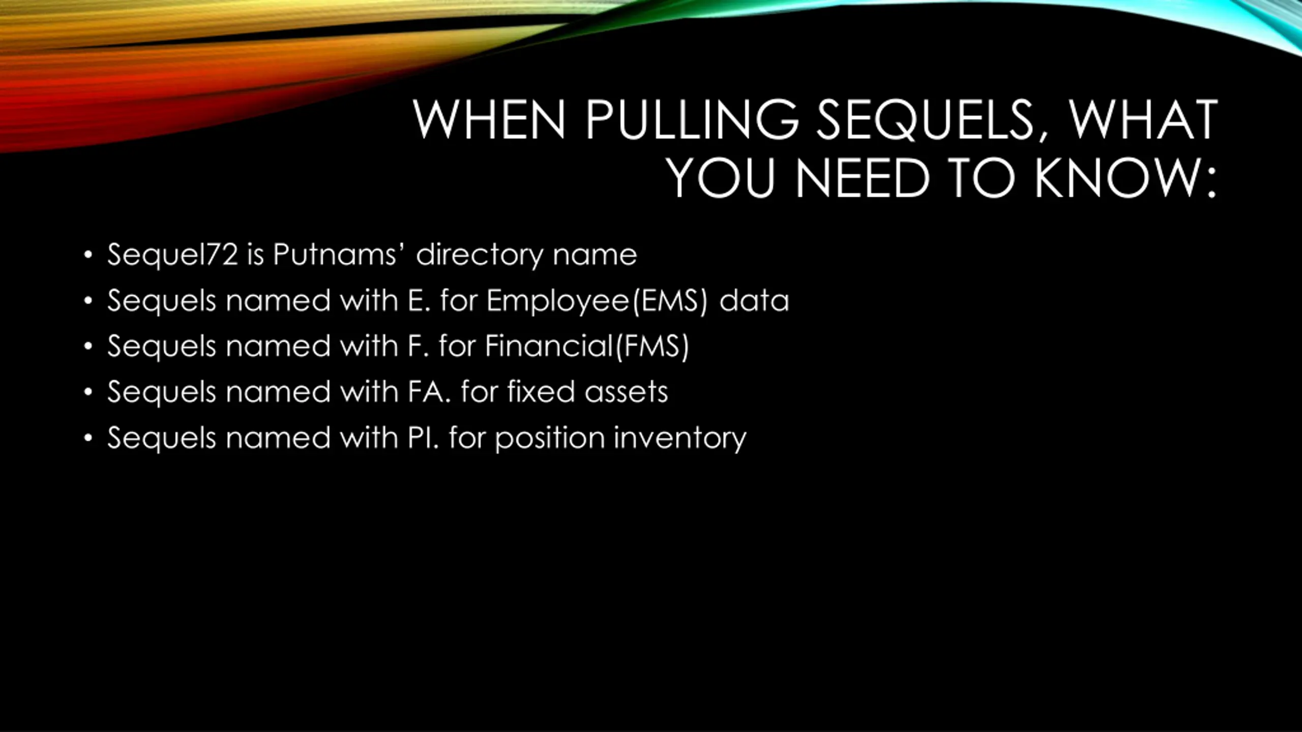 WHEN PULLING SEQUELS, WHAT YOU NEED TO KNOW: Sequel72 is Putnams directory name Sequels named with E. for Employee(EMS) data Sequels named with F. for Financial(FMS) Sequels named with FA. for fixed assets Sequels named with PI. for position inventory