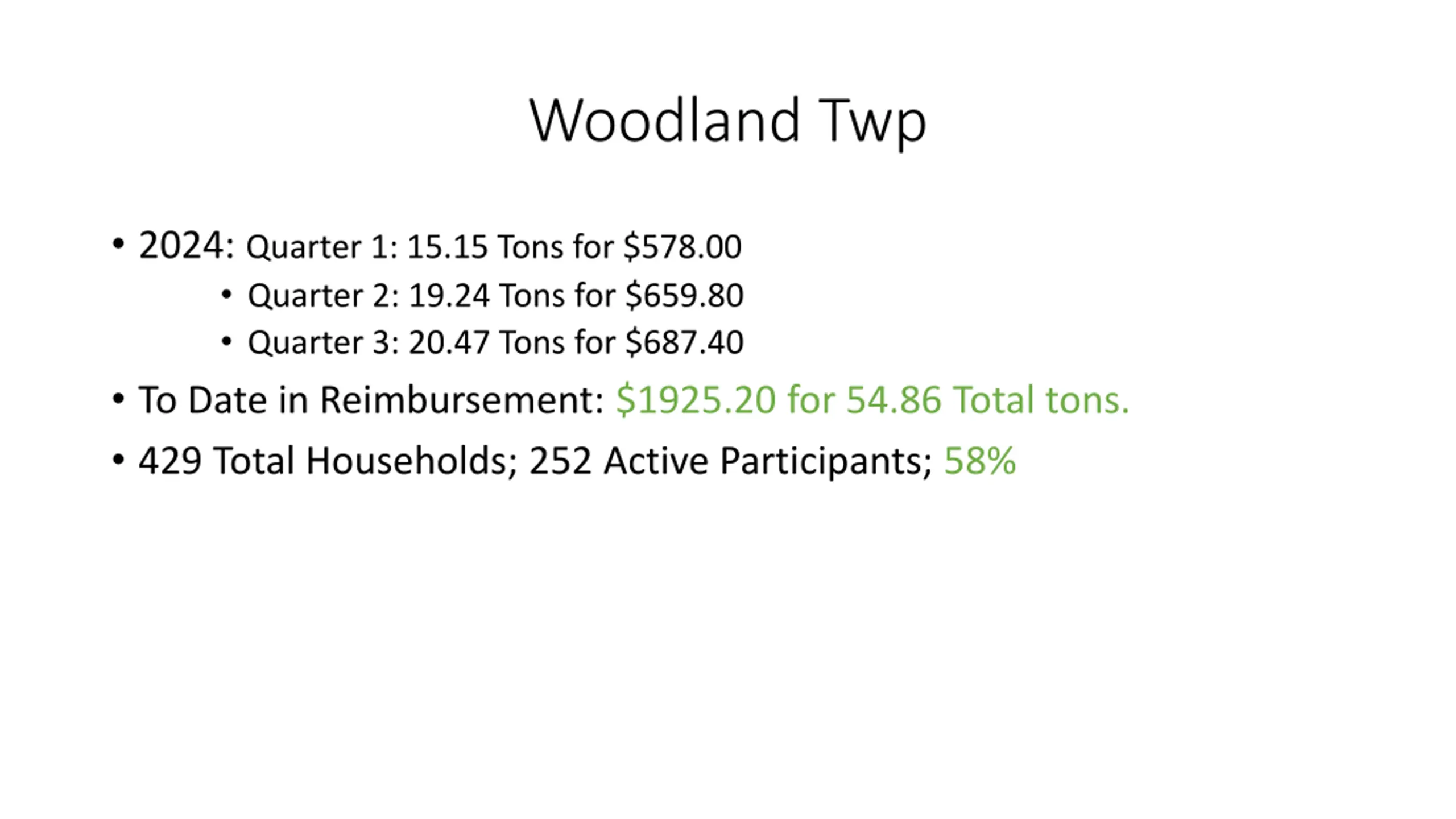 Woodland Twp 2024: Quarter 1: 15.15 Tons for $578.00 Quarter 2: 19.24 Tons for $659.80 Quarter 3: 20.47 Tons for $687.40 To Date in Reimbursement: $1925.20 for 54.86 Total tons. 429 Total Households; 252 Active Participants; 58%