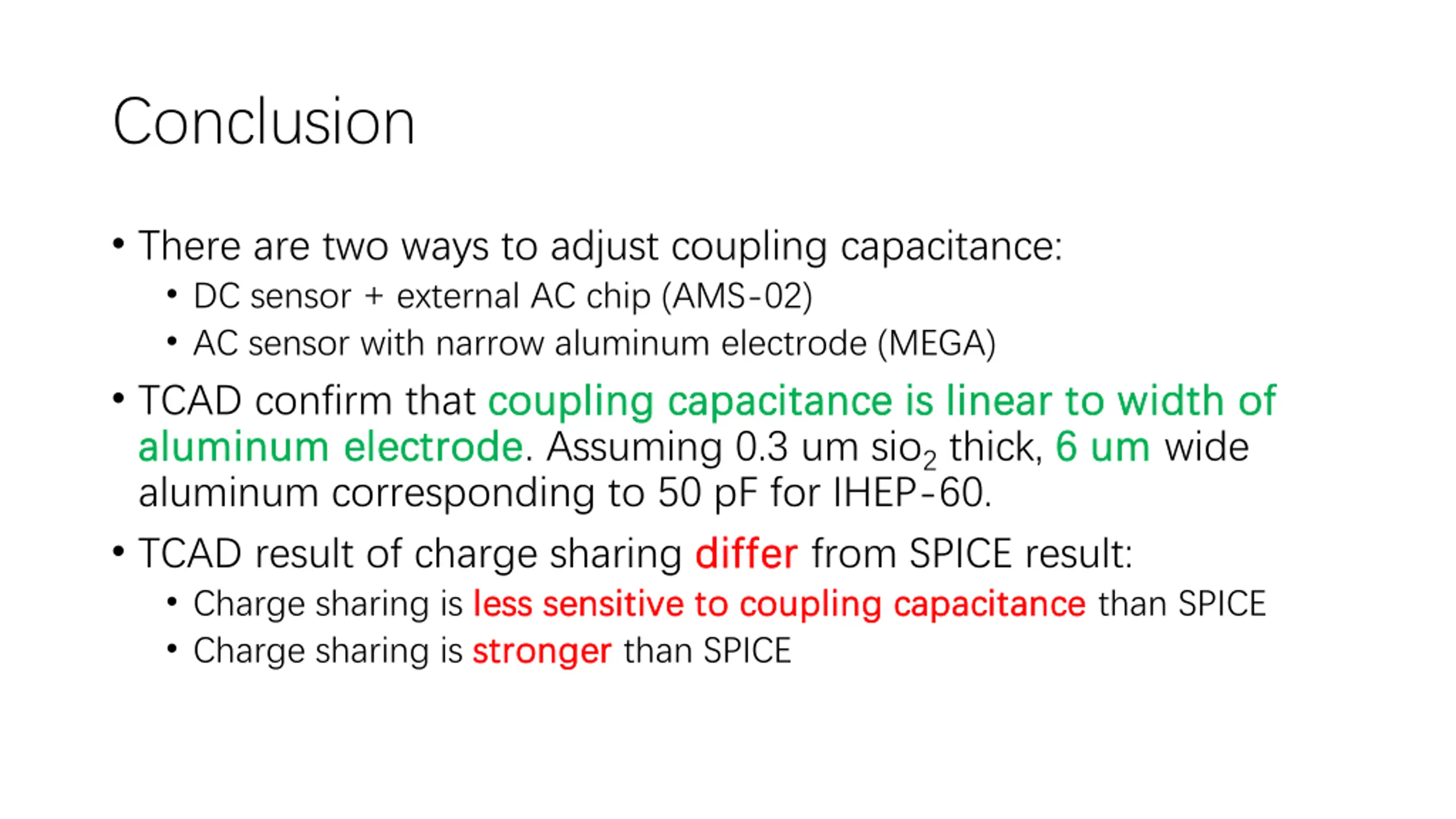 Conclusion There are two ways to adjust coupling capacitance: DC sensor + external AC chip (AMS-02) AC sensor with narrow aluminum electrode (MEGA) TCAD confirm that coupling capacitance is linear to width of coupling capacitance is linear to width of aluminum electrode aluminum electrode. Assuming 0.3 um sio2thick, 6 um aluminum corresponding to 50 pF for IHEP-60. TCAD result of charge sharing differ differ from SPICE result: Charge sharing is less sensitive to coupling capacitance less sensitive to coupling capacitance than SPICE Charge sharing is stronger stronger than SPICE 6 um wide