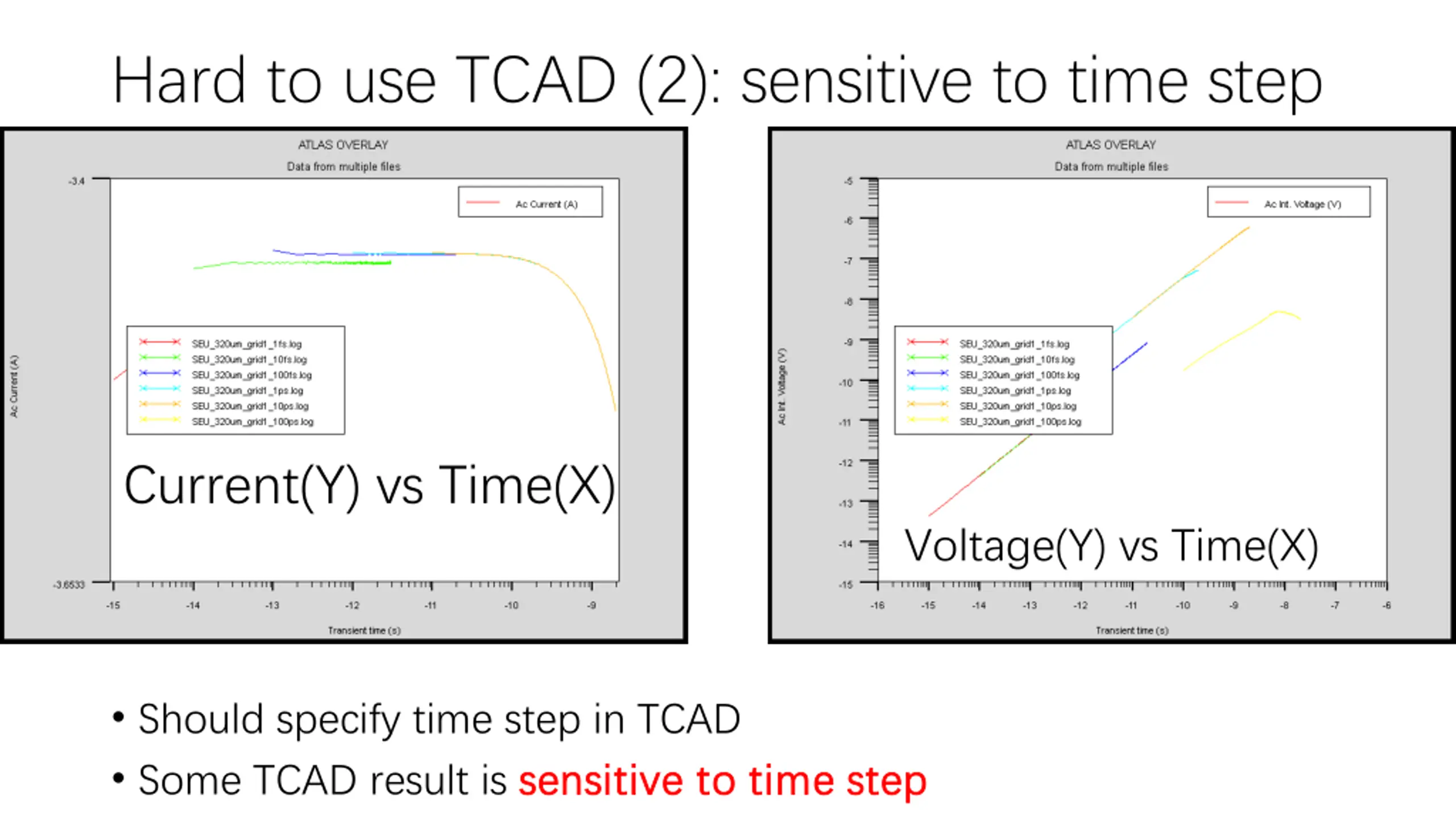 Hard to use TCAD (2): sensitive to time step Current(Y) vs Time(X) Voltage(Y) vs Time(X) Should specify time step in TCAD Some TCAD result is sensitive to time step sensitive to time step