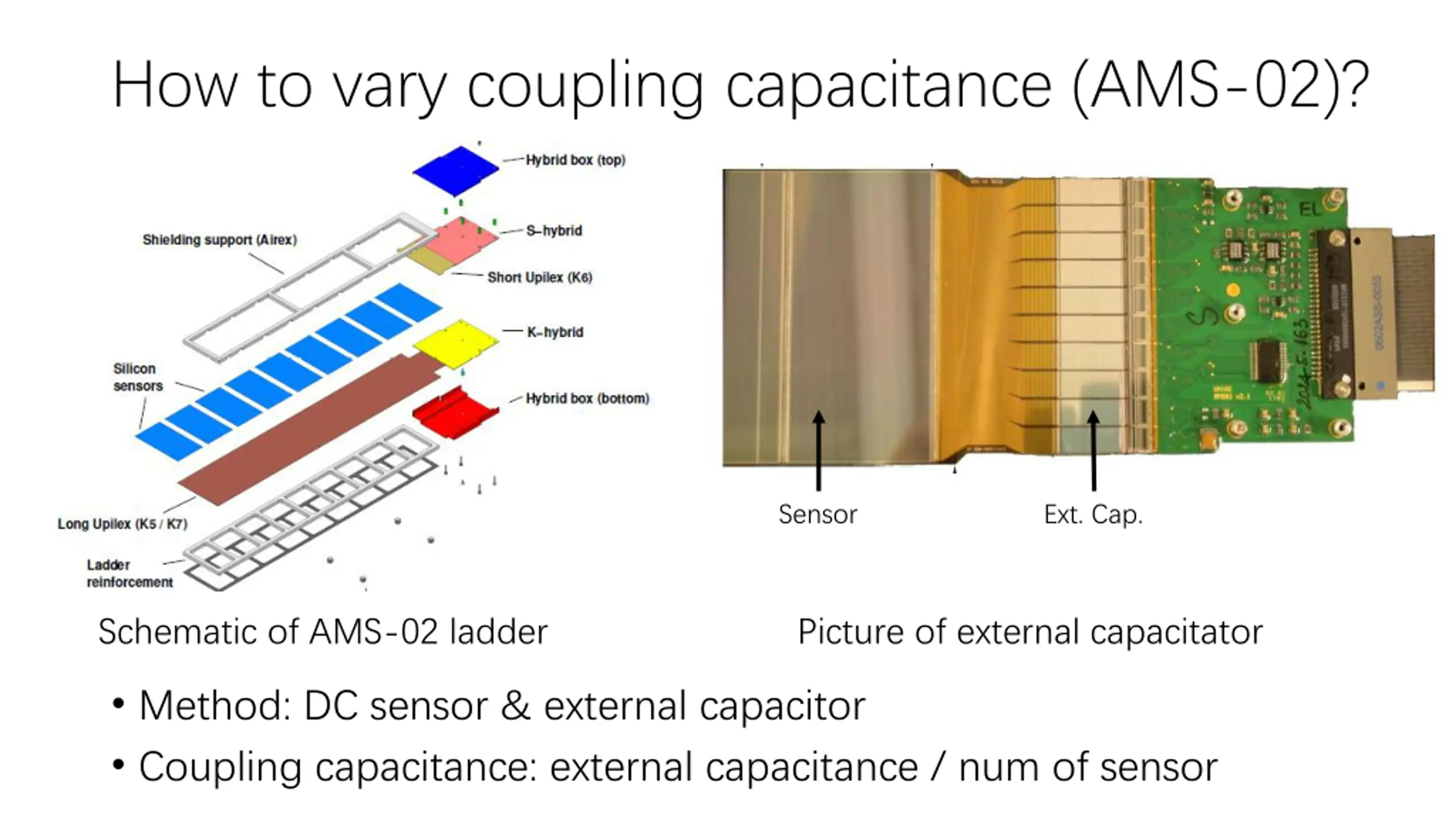 How to vary coupling capacitance (AMS-02)? Sensor Ext. Cap. Schematic of AMS-02 ladder Picture of external capacitator Method: DC sensor & external capacitor Coupling capacitance: external capacitance / num of sensor