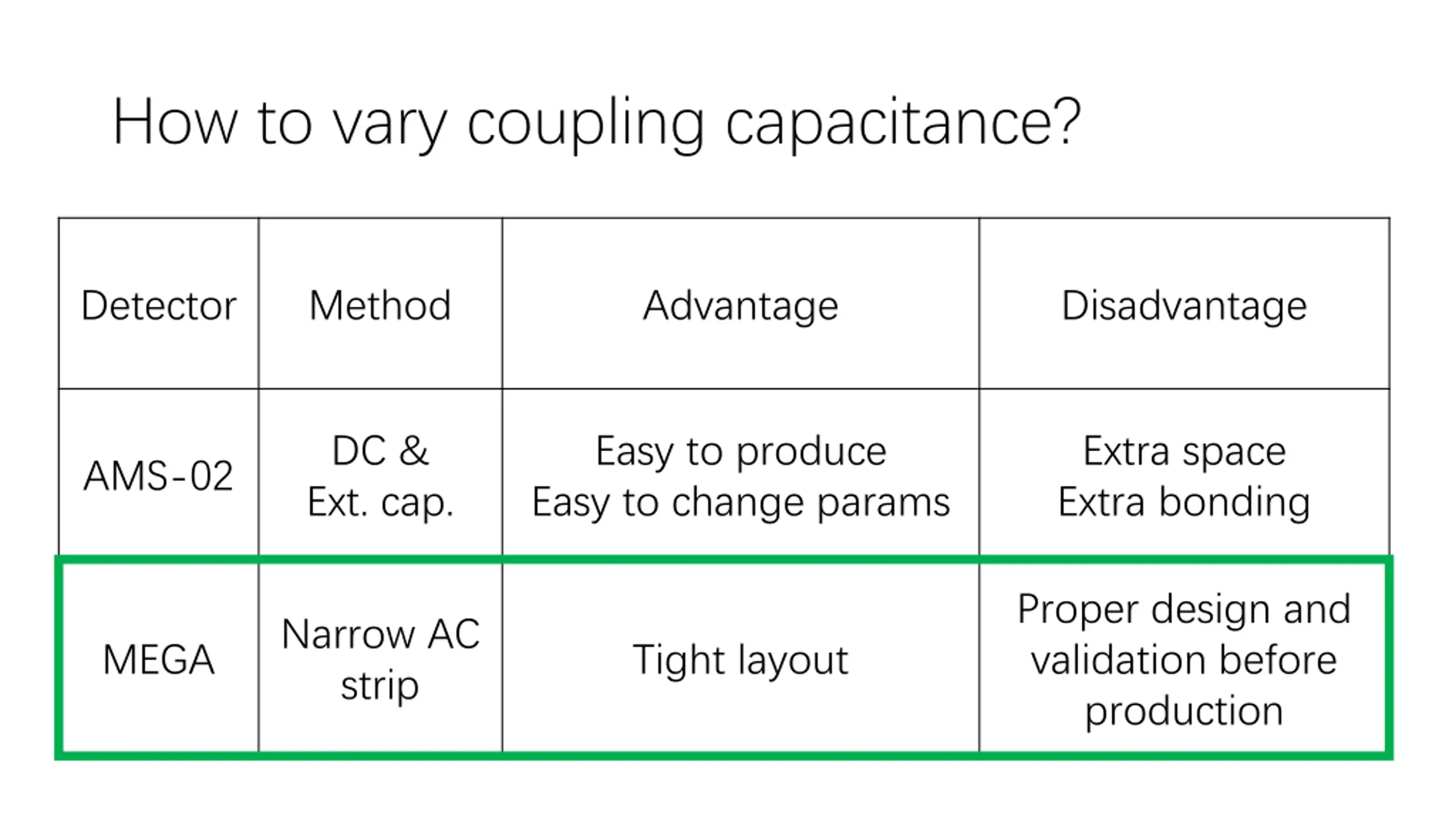 How to vary coupling capacitance? Detector Method Advantage Disadvantage DC & Ext. cap. Easy to produce Easy to change params Extra space Extra bonding AMS-02 Proper design and validation before production Narrow AC strip MEGA Tight layout