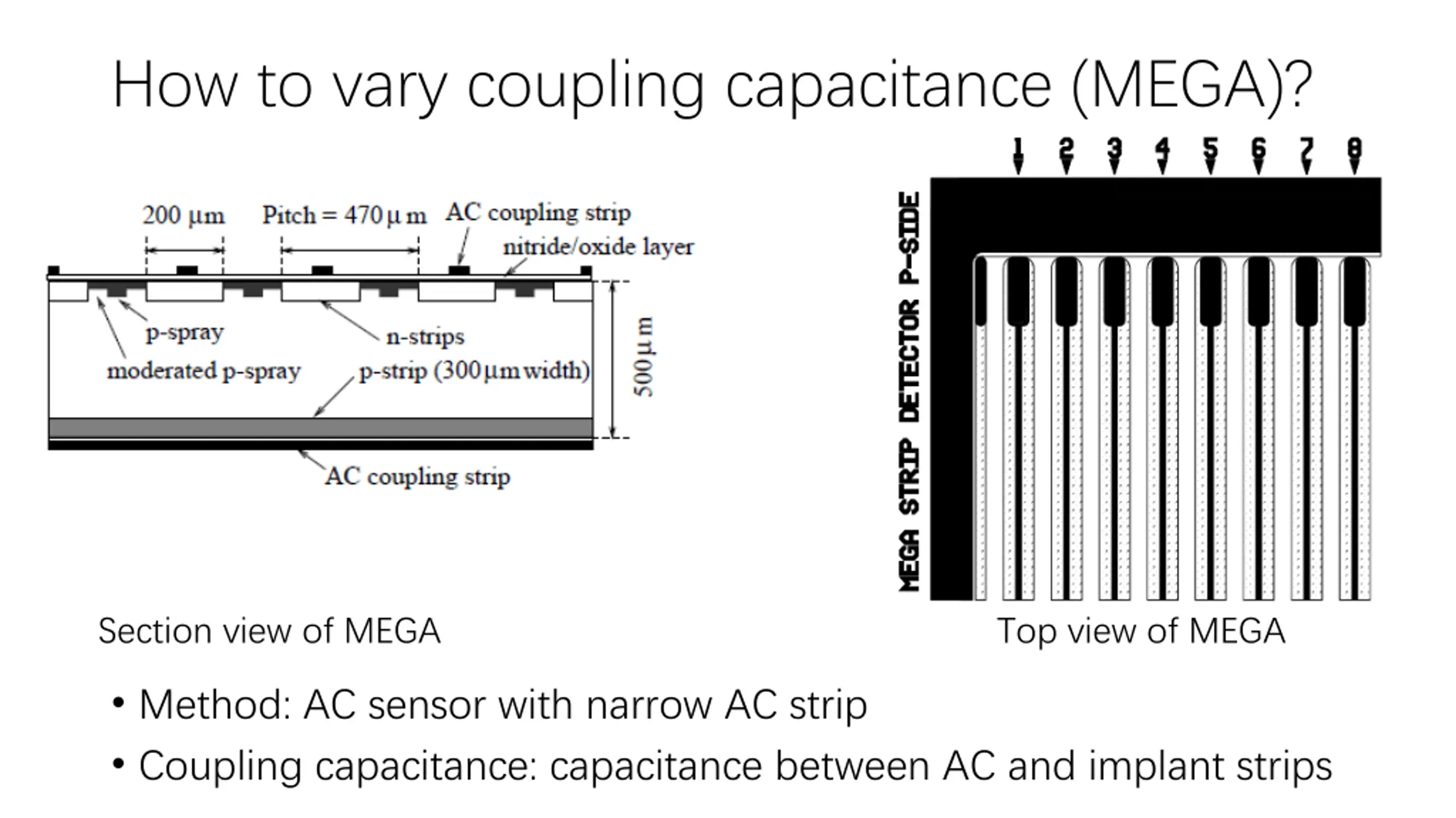 How to vary coupling capacitance (MEGA)? Section view of MEGA Top view of MEGA Method: AC sensor with narrow AC strip Coupling capacitance: capacitance between AC and implant strips
