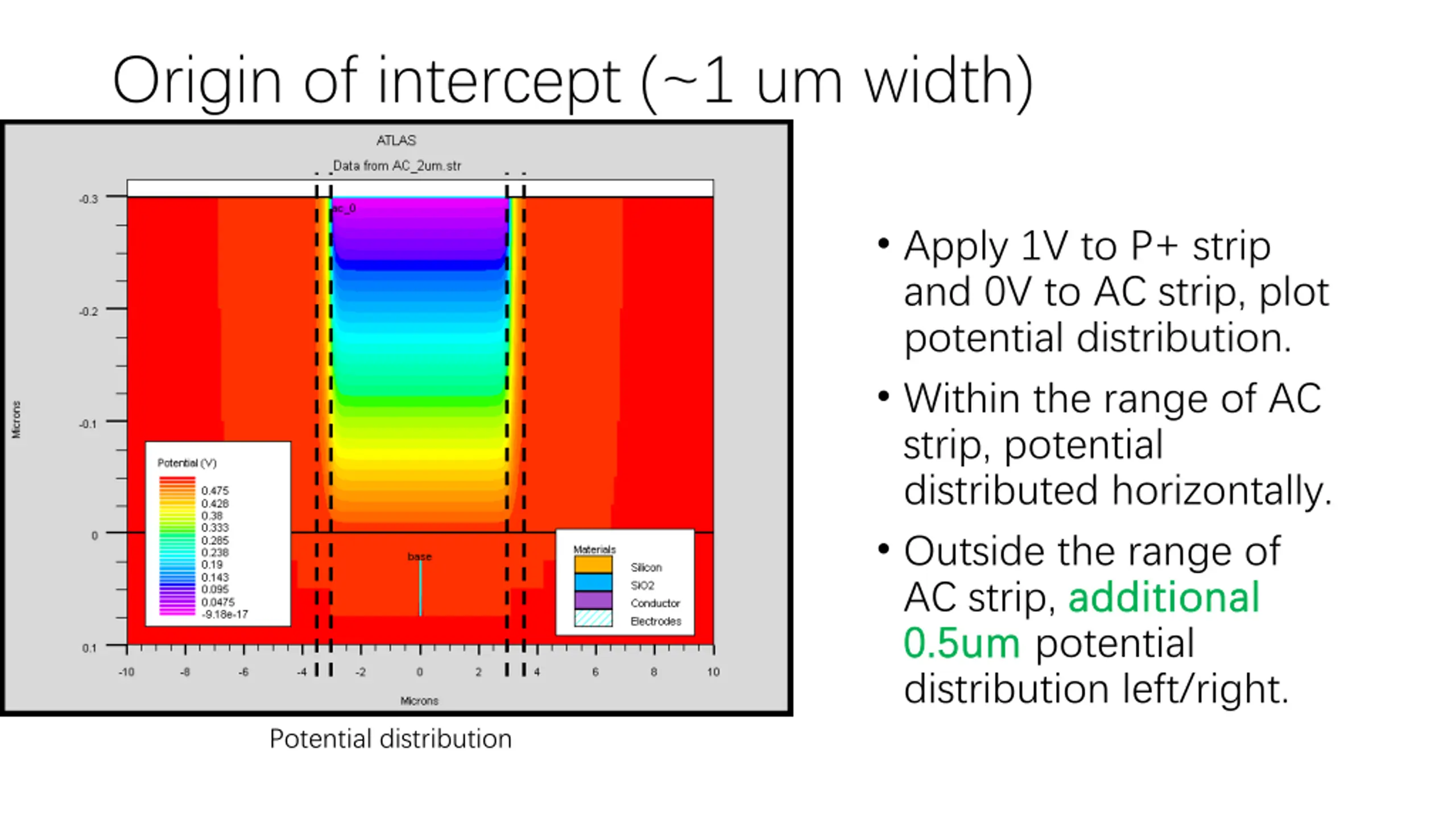 Origin of intercept (~1 um width) Apply 1V to P+ strip and 0V to AC strip, plot potential distribution. Within the range of AC strip, potential distributed horizontally. Outside the range of AC strip, additional additional 0.5um 0.5um potential distribution left/right. Potential distribution