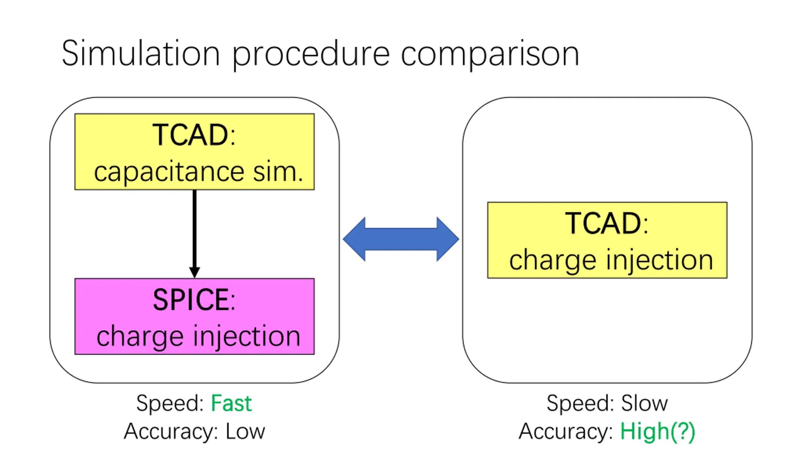 Simulation procedure comparison TCAD TCAD: capacitance sim. TCAD TCAD: charge injection SPICE SPICE: charge injection Speed: Fast Accuracy: Low Fast Speed: Slow Accuracy: High(?) High(?)