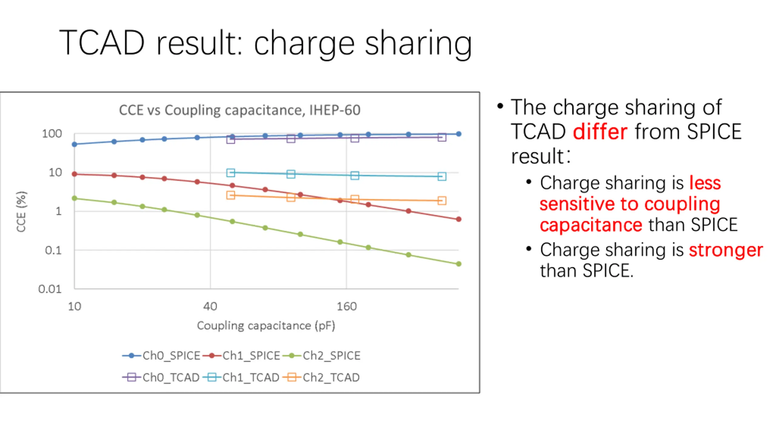 TCAD result: charge sharing The charge sharing of TCAD differ differ from SPICE result Charge sharing is less sensitive to coupling sensitive to coupling capacitance capacitance than SPICE Charge sharing is stronger than SPICE. less stronger