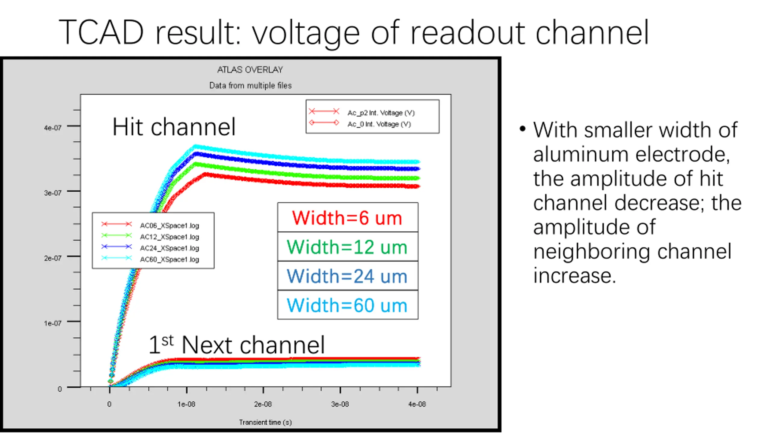 TCAD result: voltage of readout channel Hit channel With smaller width of aluminum electrode, the amplitude of hit channel decrease; the amplitude of neighboring channel increase. Width=6 um Width=6 um Width=12 um Width=12 um Width=24 um Width=24 um Width=60 um Width=60 um 1stNext channel