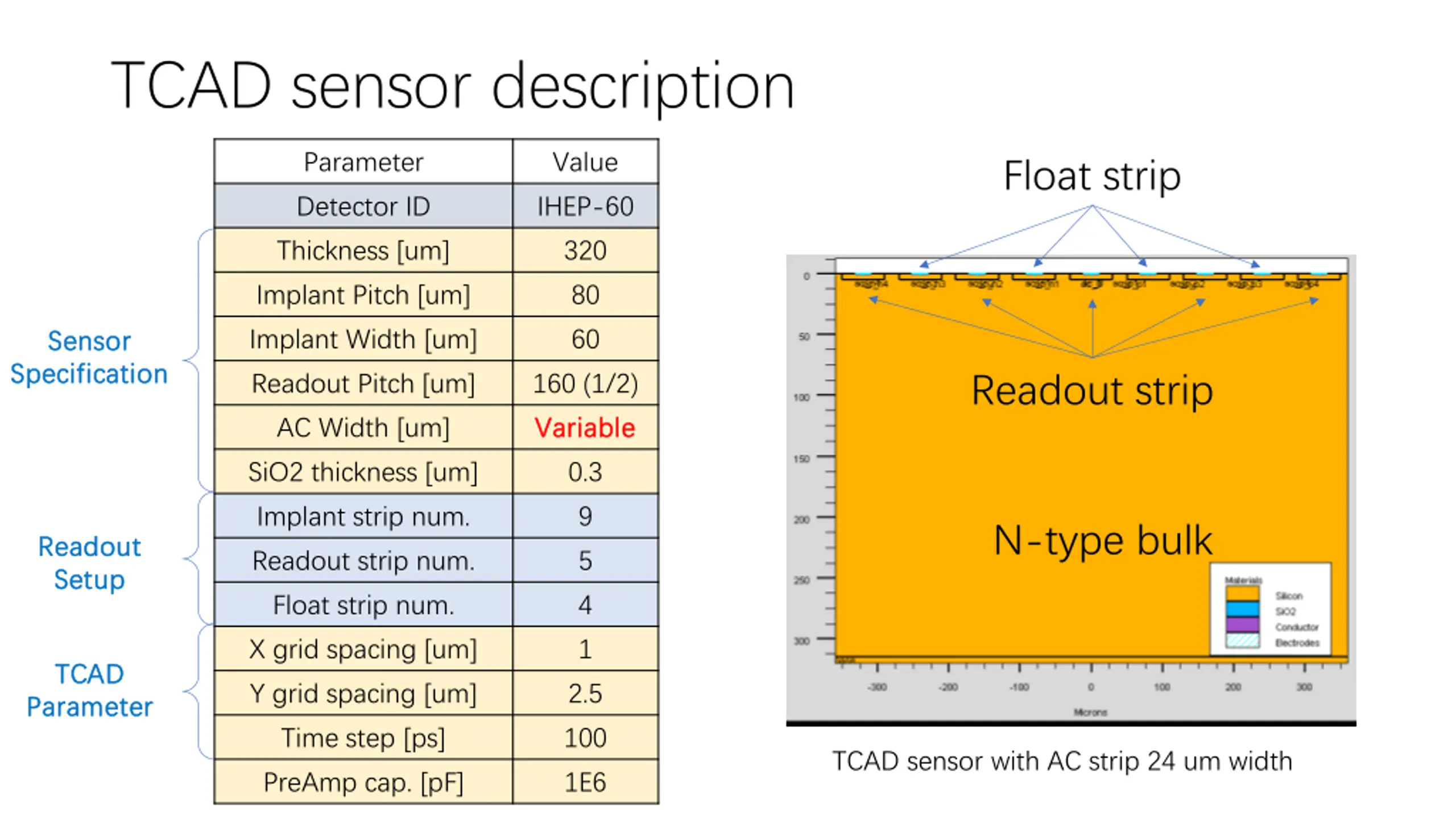 TCAD sensor description Parameter Value Float strip Detector ID IHEP-60 Thickness [um] 320 Implant Pitch [um] 80 Implant Width [um] 60 Sensor Sensor Specification Specification Readout strip Readout Pitch [um] 160 (1/2) AC Width [um] Variable Variable SiO2 thickness [um] 0.3 Implant strip num. 9 N-type bulk Readout Readout Setup Setup Readout strip num. 5 Float strip num. 4 X grid spacing [um] 1 TCAD TCAD Parameter Parameter Y grid spacing [um] 2.5 Time step [ps] 100 TCAD sensor with AC strip 24 um width PreAmp cap. [pF] 1E6