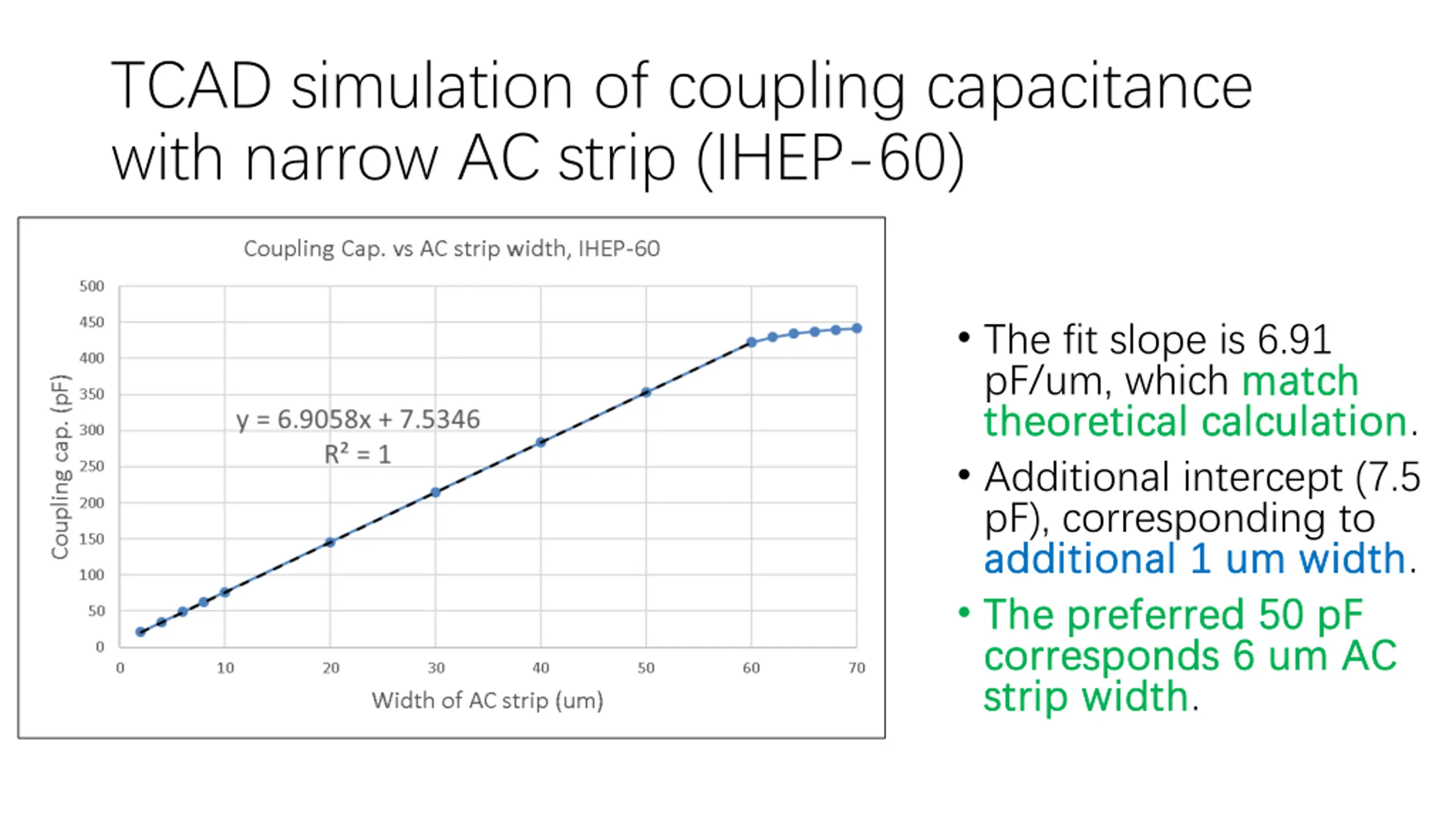 TCAD simulation of coupling capacitance with narrow AC strip (IHEP-60) The fit slope is 6.91 pF/um, which match theoretical calculation theoretical calculation. Additional intercept (7.5 pF), corresponding to additional 1 um width additional 1 um width. The preferred 50 pF The preferred 50 pF corresponds 6 um AC corresponds 6 um AC strip width strip width. match