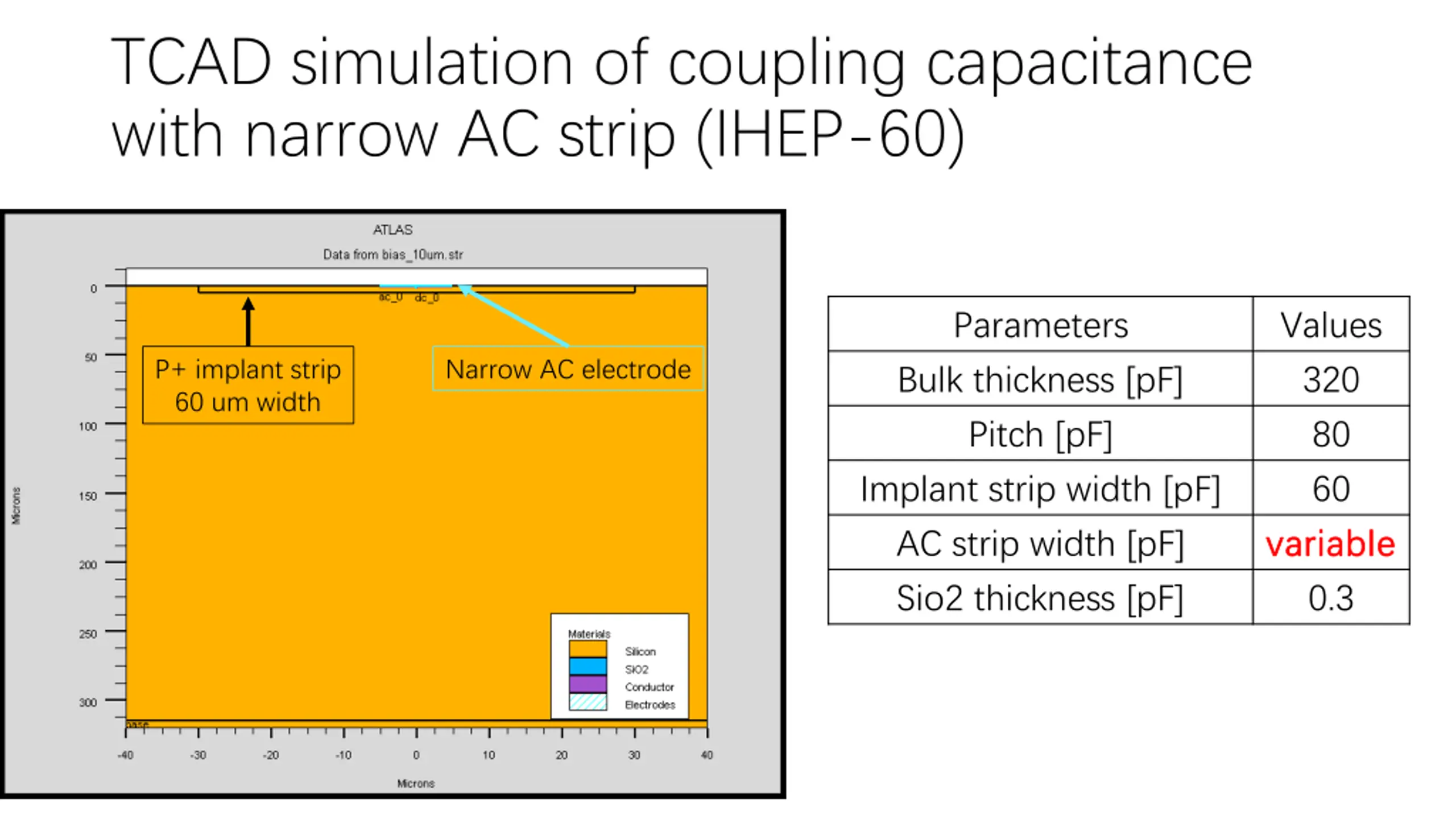 TCAD simulation of coupling capacitance with narrow AC strip (IHEP-60) Parameters Bulk thickness [pF] Pitch [pF] Implant strip width [pF] AC strip width [pF] Sio2 thickness [pF] Values 320 80 60 variable variable 0.3 P+ implant strip 60 um width Narrow AC electrode