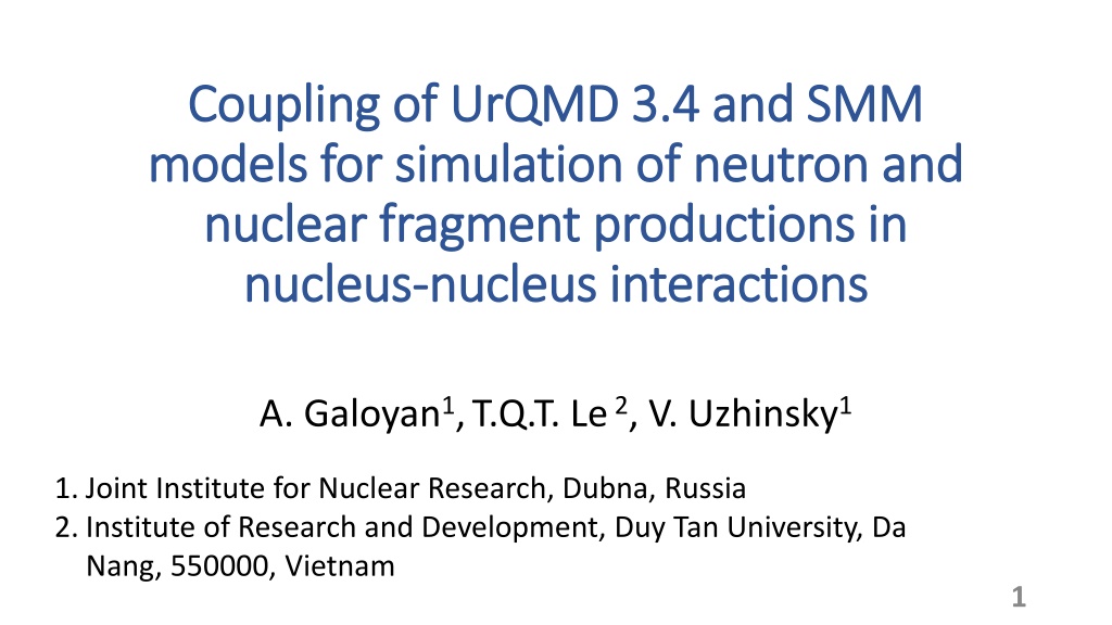 Coupling of UrQMD 3.4 and SMM Coupling of UrQMD 3.4 and SMM models for simulation of neutron and models for simulation of neutron and nuclear fragment productions in nuclear fragment productions in nucleus nucleus- -nucleus interactions nucleus interactions A. Galoyan1,T.Q.T. Le2, V. Uzhinsky1 1. Joint Institute for Nuclear Research, Dubna, Russia 2. Institute of Research and Development, Duy Tan University, Da Nang, 550000, Vietnam 1