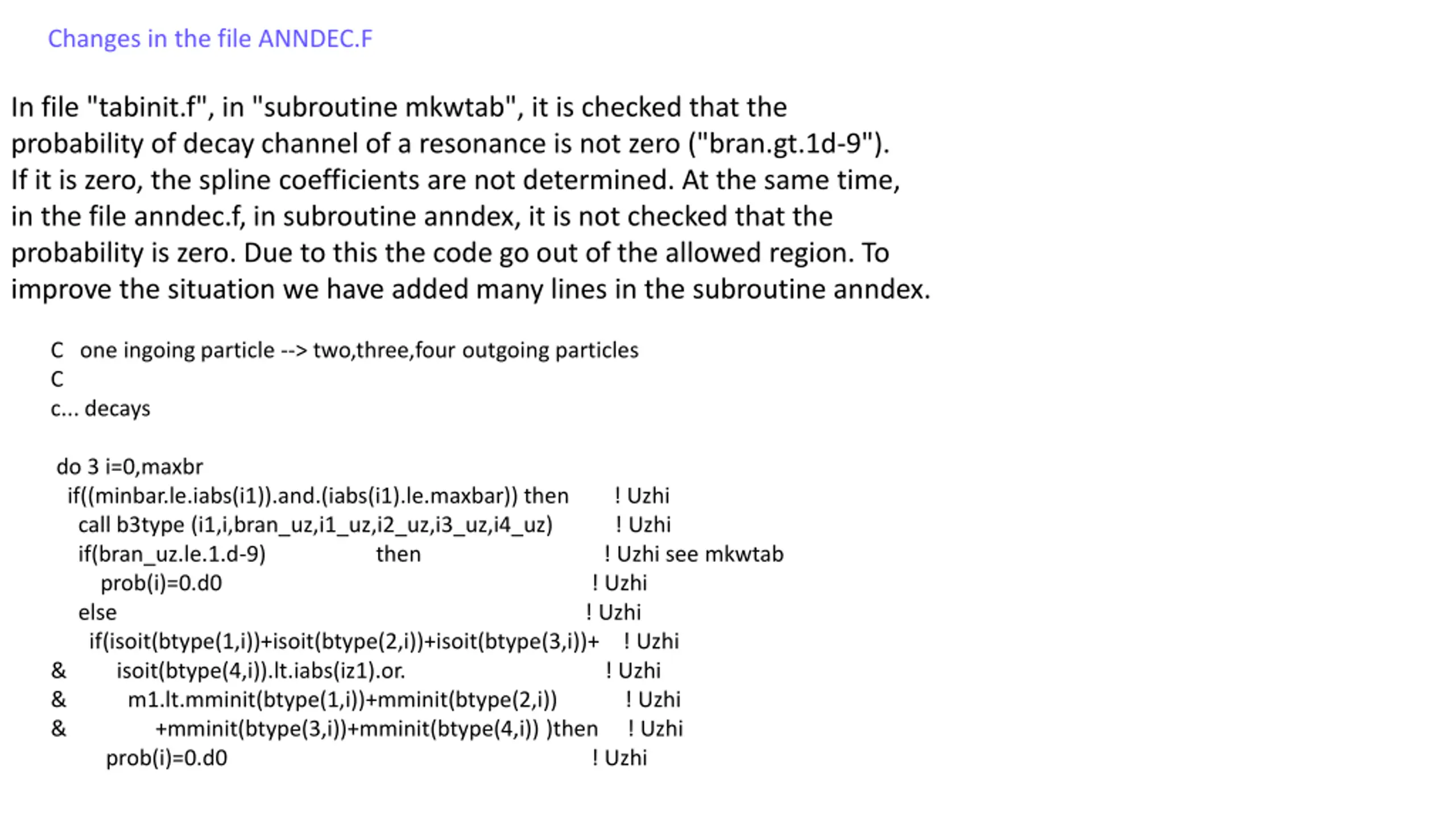 Changes in the file ANNDEC.F In file "tabinit.f", in "subroutine mkwtab", it is checked that the probability of decay channel of a resonance is not zero ("bran.gt.1d-9"). If it is zero, the spline coefficients are not determined. At the same time, in the file anndec.f, in subroutine anndex, it is not checked that the probability is zero. Due to this the code go out of the allowed region. To improve the situation we have added many lines in the subroutine anndex. C one ingoing particle --> two,three,four outgoing particles C c... decays do 3 i=0,maxbr if((minbar.le.iabs(i1)).and.(iabs(i1).le.maxbar)) then ! Uzhi call b3type (i1,i,bran_uz,i1_uz,i2_uz,i3_uz,i4_uz) ! Uzhi if(bran_uz.le.1.d-9) then prob(i)=0.d0 else if(isoit(btype(1,i))+isoit(btype(2,i))+isoit(btype(3,i))+ ! Uzhi & isoit(btype(4,i)).lt.iabs(iz1).or. & m1.lt.mminit(btype(1,i))+mminit(btype(2,i)) ! Uzhi & +mminit(btype(3,i))+mminit(btype(4,i)) )then ! Uzhi prob(i)=0.d0 ! Uzhi see mkwtab ! Uzhi ! Uzhi ! Uzhi ! Uzhi