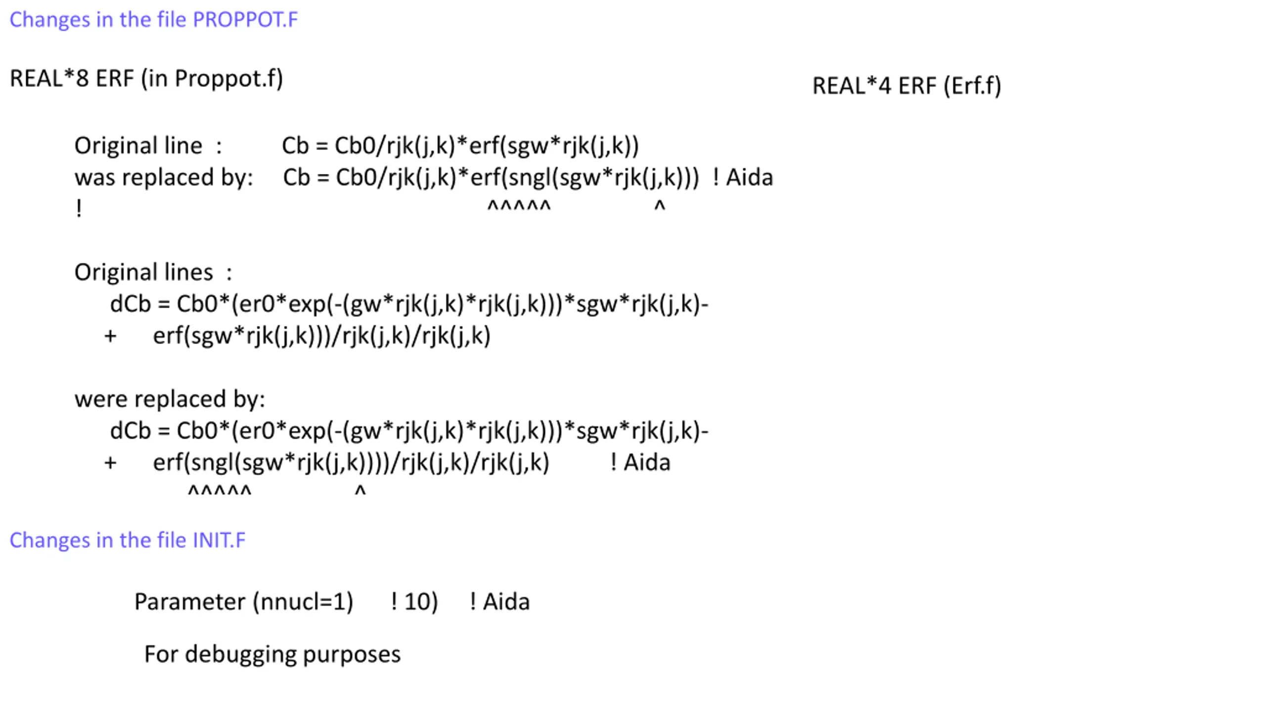 Changes in the file PROPPOT.F REAL*8 ERF (in Proppot.f) REAL*4 ERF (Erf.f) Original line : was replaced by: Cb = Cb0/rjk(j,k)*erf(sngl(sgw*rjk(j,k))) ! Aida ! Cb = Cb0/rjk(j,k)*erf(sgw*rjk(j,k)) ^^^^^ ^ Original lines : dCb = Cb0*(er0*exp(-(gw*rjk(j,k)*rjk(j,k)))*sgw*rjk(j,k)- + erf(sgw*rjk(j,k)))/rjk(j,k)/rjk(j,k) were replaced by: dCb = Cb0*(er0*exp(-(gw*rjk(j,k)*rjk(j,k)))*sgw*rjk(j,k)- + erf(sngl(sgw*rjk(j,k))))/rjk(j,k)/rjk(j,k) ! Aida ^^^^^ ^ Changes in the file INIT.F Parameter (nnucl=1) ! 10) ! Aida For debugging purposes
