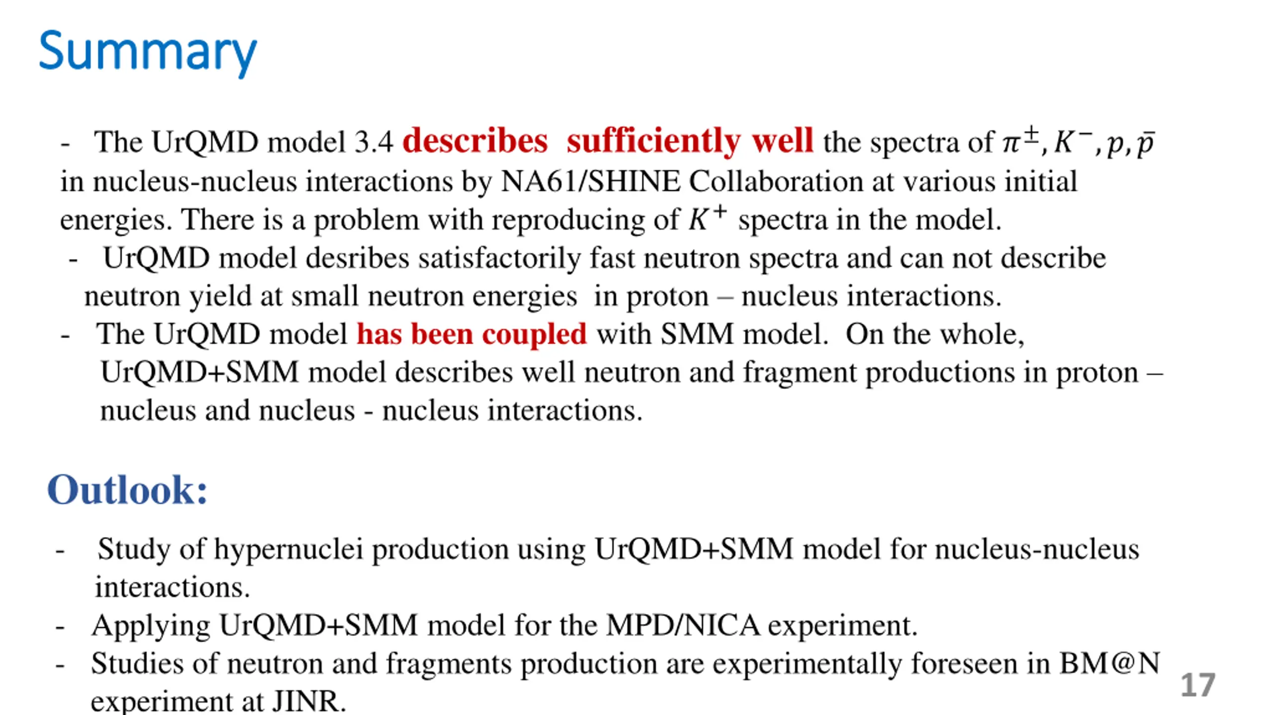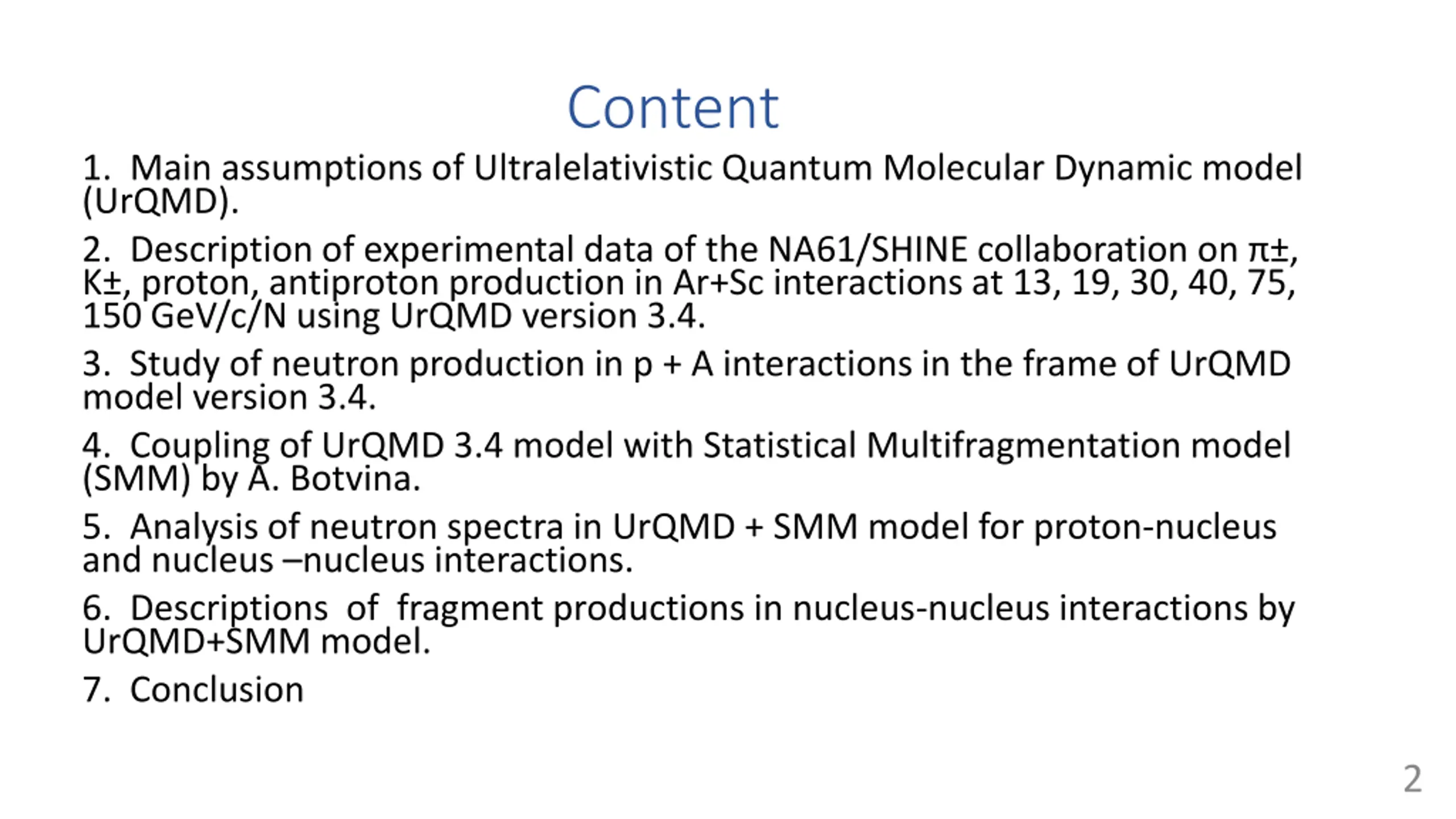 Content 1. Main assumptions of Ultralelativistic Quantum Molecular Dynamic model (UrQMD). 2. Description of experimental data of the NA61/SHINE collaboration on , K , proton, antiproton production in Ar+Sc interactions at 13, 19, 30, 40, 75, 150 GeV/c/N using UrQMD version 3.4. 3. Study of neutron production in p + A interactions in the frame of UrQMD model version 3.4. 4. Coupling of UrQMD 3.4 model with Statistical Multifragmentation model (SMM) by A. Botvina. 5. Analysis of neutron spectra in UrQMD + SMM model for proton-nucleus and nucleus nucleus interactions. 6. Descriptions of fragment productions in nucleus-nucleus interactions by UrQMD+SMM model. 7. Conclusion 2
