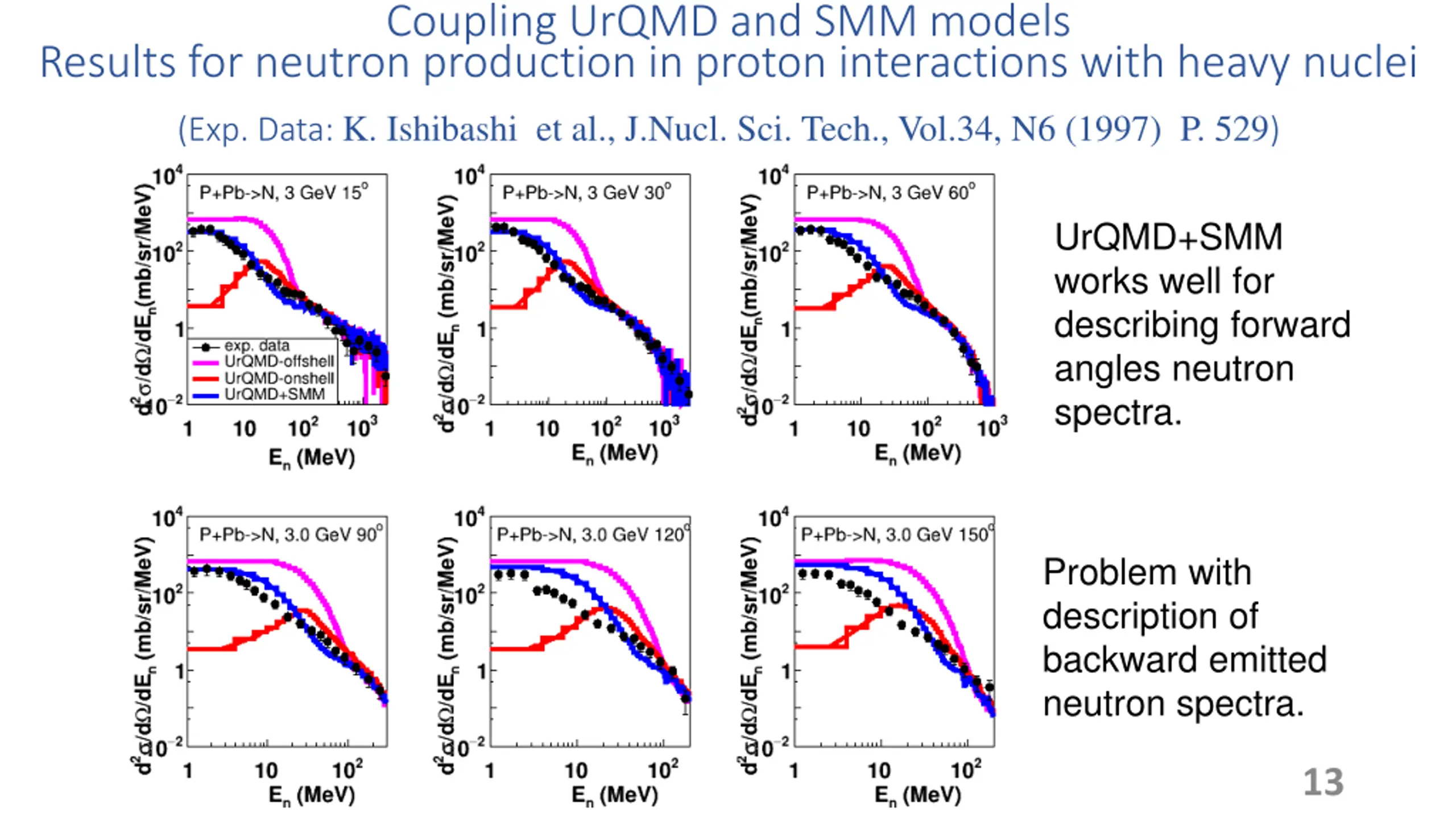 Coupling UrQMD and SMM models. Results for neutron production in p+Fe interactions (Exp. Data: K. Ishibashi et al., J.Nucl. Sci. Tech., Vol.34, N6 (1997) P. 529) UrQMD+SMM works well for all angles for intermediate nuclei. 12