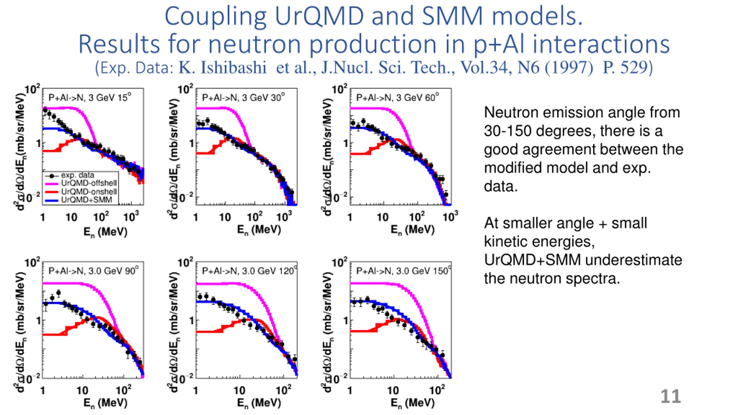 Coupling UrQMD and SMM models. Results for neutron production in p+Al interactions (Exp. Data: K. Ishibashi et al., J.Nucl. Sci. Tech., Vol.34, N6 (1997) P. 529) Neutron emission angle from 30-150 degrees, there is a good agreement between the modified model and exp. data. At smaller angle + small kinetic energies, UrQMD+SMM underestimate the neutron spectra. 11