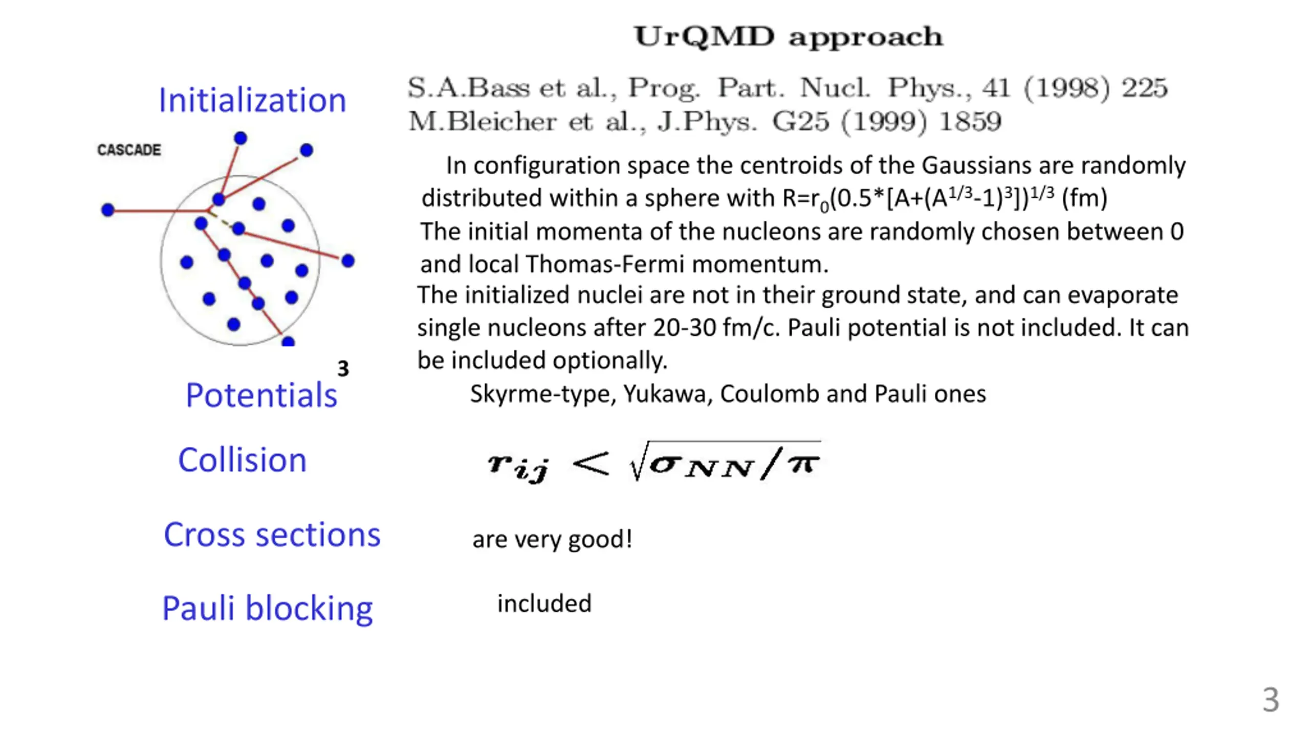 Initialization In configuration space the centroids of the Gaussians are randomly distributed within a sphere with R=r0(0.5*[A+(A1/3-1)3])1/3 (fm) The initial momenta of the nucleons are randomly chosen between 0 and local Thomas-Fermi momentum. The initialized nuclei are not in their ground state, and can evaporate single nucleons after 20-30 fm/c. Pauli potential is not included. It can be included optionally. Skyrme-type, Yukawa, Coulomb and Pauli ones 3 Potentials Collision Cross sections are very good! included Pauli blocking 3