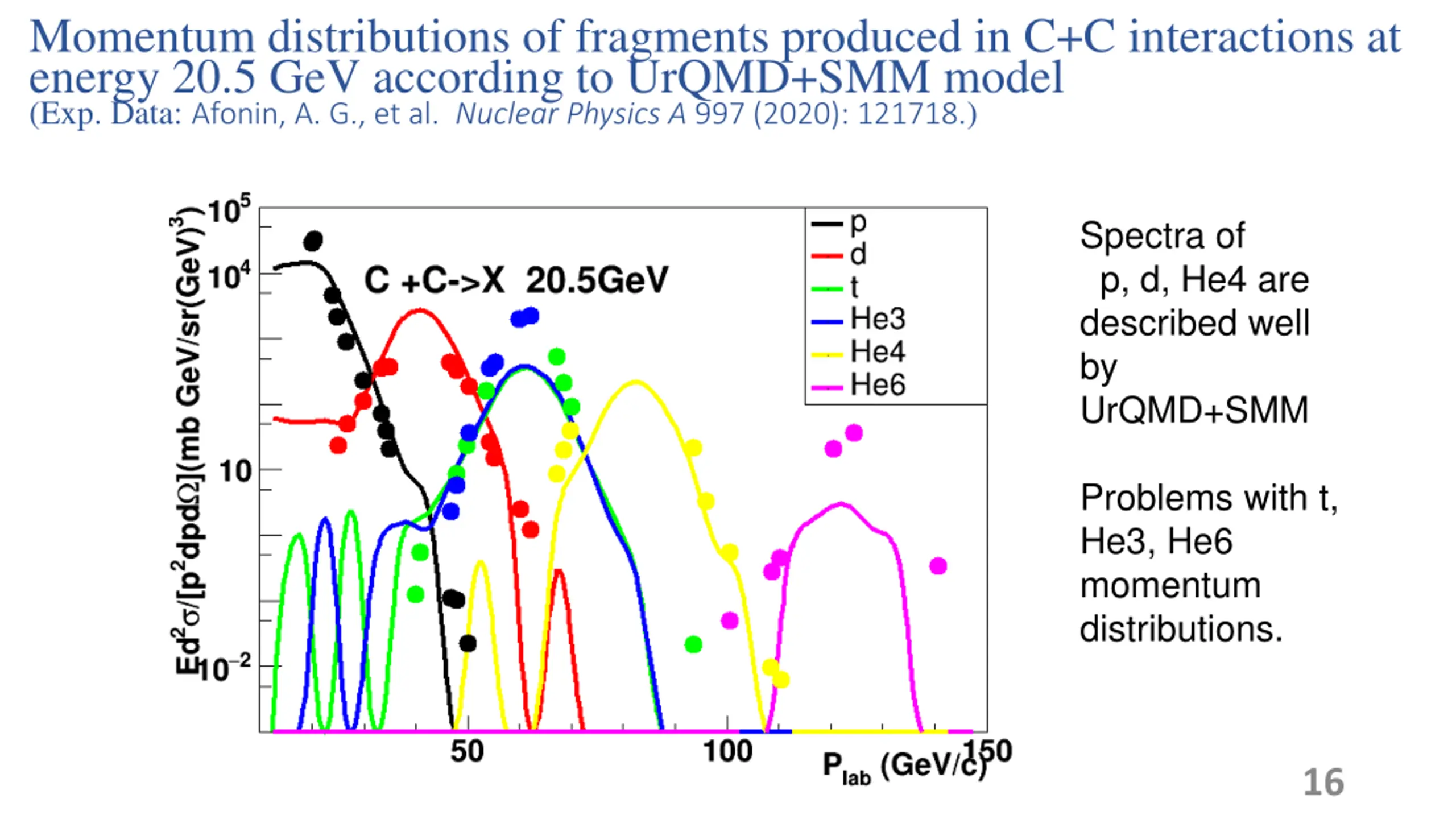 Momentum distributions of fragments produced in C+C interactions at energy 20.5 GeV according to UrQMD+SMM model (Exp. Data: Afonin, A. G., et al. Nuclear Physics A 997 (2020): 121718.) Spectra of p, d, He4 are described well by UrQMD+SMM Problems with t, He3, He6 momentum distributions. 16