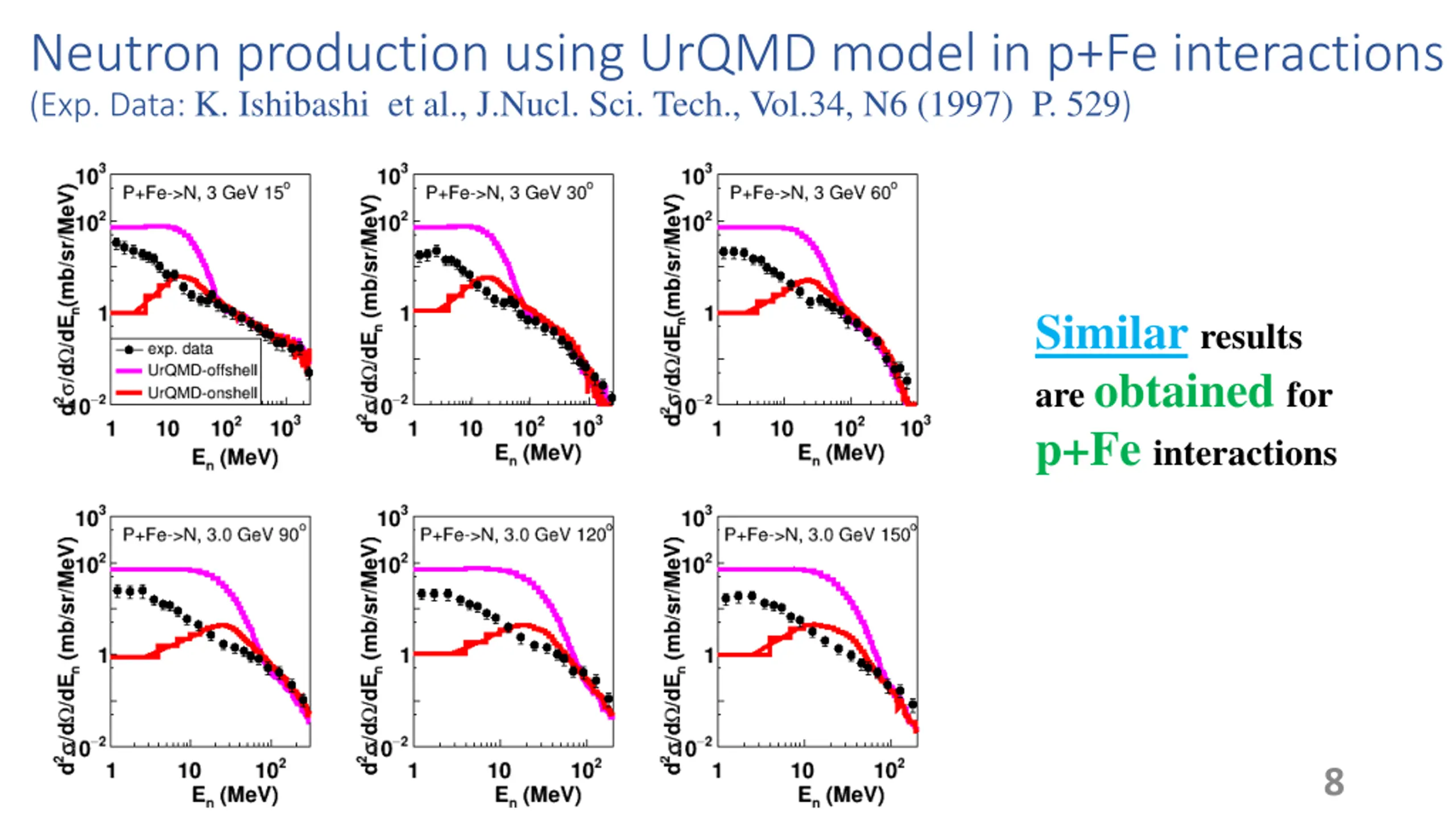 Neutron production using UrQMD model in p+Fe interactions (Exp. Data: K. Ishibashi et al., J.Nucl. Sci. Tech., Vol.34, N6 (1997) P. 529) Similar results are obtained for p+Fe interactions 8