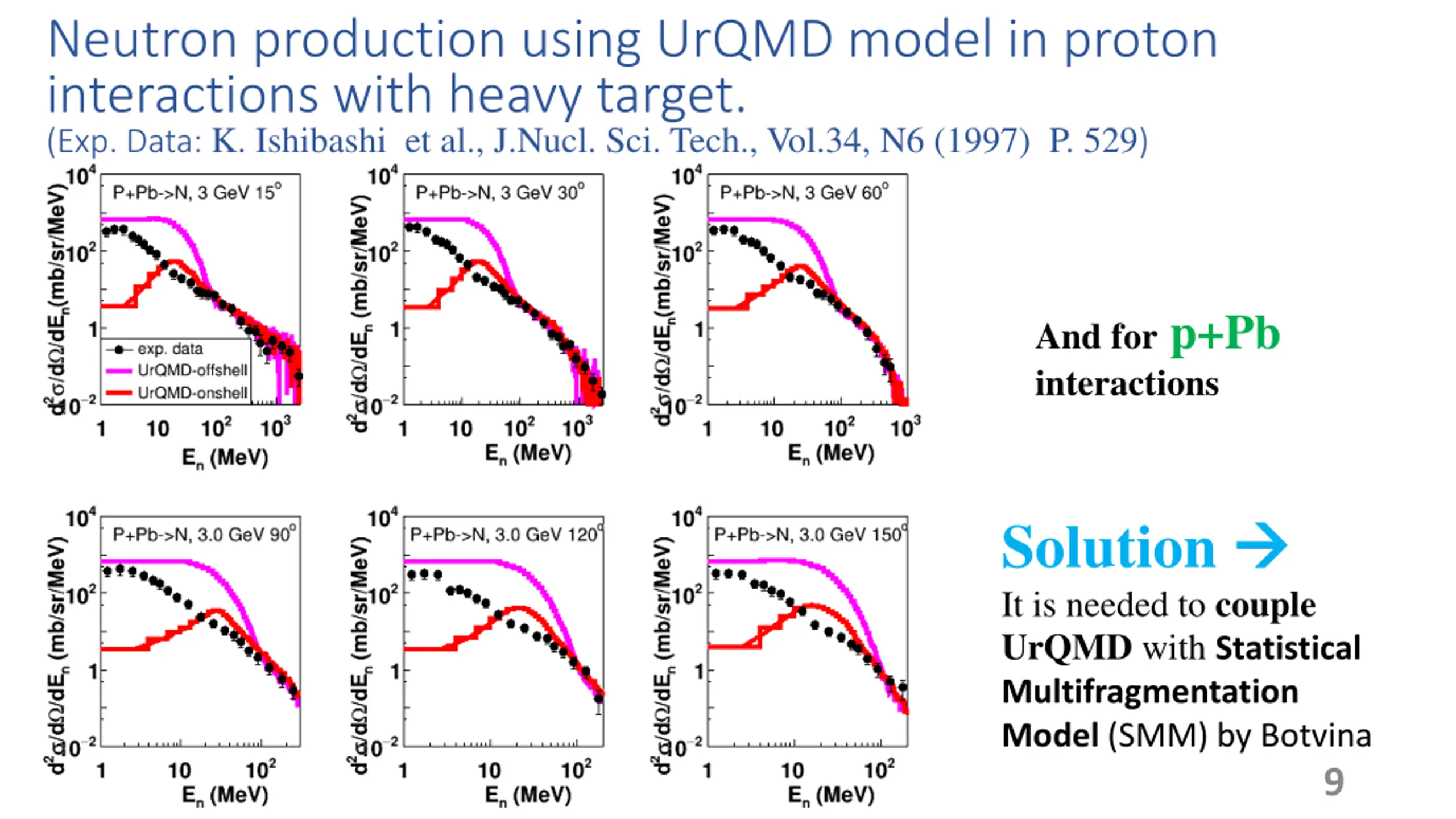 Neutron production using UrQMD model in proton interactions with heavy target. (Exp. Data: K. Ishibashi et al., J.Nucl. Sci. Tech., Vol.34, N6 (1997) P. 529) And for p+Pb interactions Solution It is needed to couple UrQMD withStatistical Multifragmentation Model (SMM) by Botvina 9